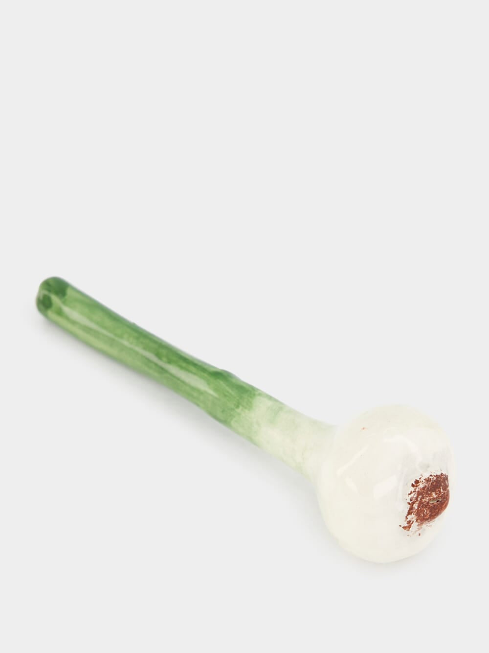 This unique ceramic garlic sculpture serves as an intriguing decorative piece, blending whimsy with elegance. Its delicate green stem transitions to a soft white bulb, creating a realistic portrayal that's sure to spark conversation. Perfect for adding an organic touch to your kitchen or dining area, it's a tribute to both nature's simplicity and artistic craftsmanship.