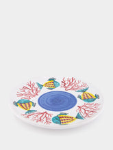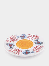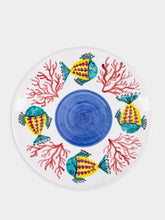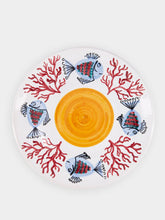 A vibrant hand-painted ceramic plate inspired by the colors and patterns of Sicily. Featuring lively depictions of fish, corals, and bright blues, this artisanal plate adds a bold, Mediterranean charm to your table setting, perfect for both casual and special occasions.
