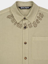 This Palm Angels beige button-up shirt jacket is crafted from premium cotton, combining casual sophistication with streetwear flair. It features a relaxed, oversized fit, a classic collar, and a bold embroidered Palm Angels logo along the neckline. The single chest pocket and buttoned cuffs add functional detailing, while the neutral tone ensures versatility for layering or standalone wear.