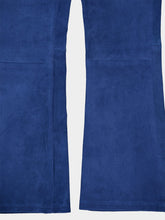 Elevate your wardrobe with these Zircon Poseidon flared pants crafted from genuine 100% lambskin stretch suede. These pants, in a striking Poseidon blue, offer both style and comfort with their soft suede texture and flattering fit. Designed as a carryover piece, they seamlessly transition through seasons, making them a versatile addition to your collection.