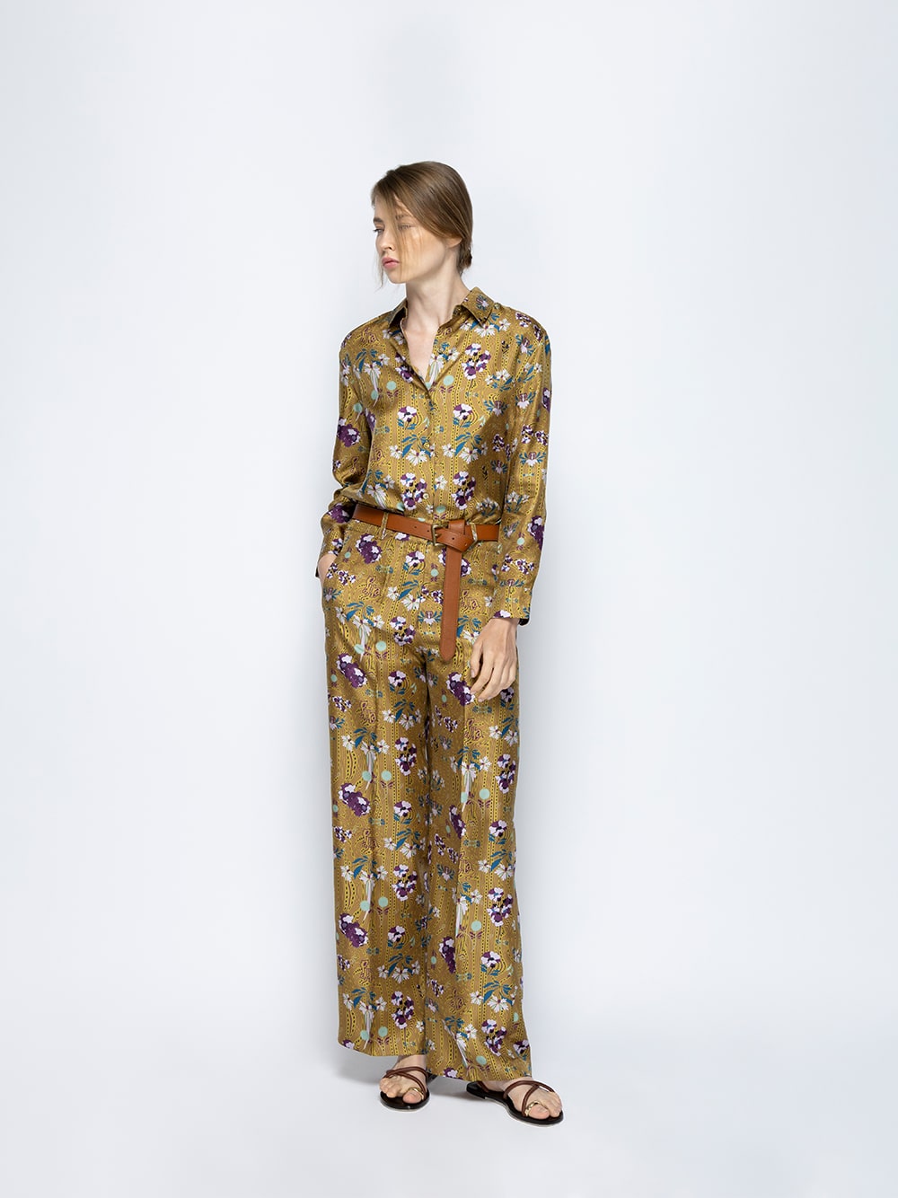 A celebration of colour and movement, the Sonia Floral Psic Printed Silk Twill Pants bring artistic flair to a fluid, tailored silhouette. Crafted from 100% silk twill, they feature a vivid mustard yellow base adorned with whimsical florals in shades of violet, green, and blue. With their high waist and wide-leg cut, these trousers are designed to stand out with effortless sophistication. Made in Portugal.