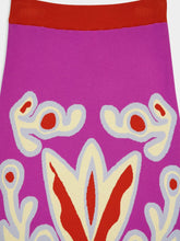 The Turner Bellflower Jacquard Skirt with Fringes is a striking piece that blends texture and artistry. Crafted in knit jacquard, this skirt features a bold pattern in shades of purple, brown, and cream, with a fringe detail at the hem adding movement and flair. Perfect for making a statement in spring and summer outfits. Made in Portugal.