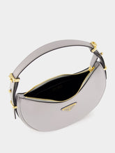 This sleek leather shoulder bag in granite gray exudes modernist allure with its elegant sinuous silhouette. Featuring a detachable, adjustable leather strap and handle, it offers versatile styling options. The bag is adorned with gold-tone metal hardware, a luxurious nappa leather interior, and a signature enameled metal triangle logo on the front. It’s a refined accessory that complements both casual and sophisticated ensembles.