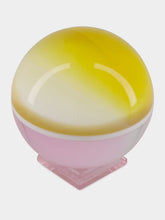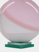 Designed to mesmerize and captivate, the Delirium Sphere embraces its playful charm. This perfect sphere features a harmonious blend of fantasy pink and glowing yellow, enhanced by the crystal's natural transparency. It stands elegantly on a two-tiered base with an emerald green surface and a delicate upper layer, showcasing meticulous glass carving craftsmanship. Available in two sizes, this piece invites you to succumb to its irresistible allure and experience its magical essence.