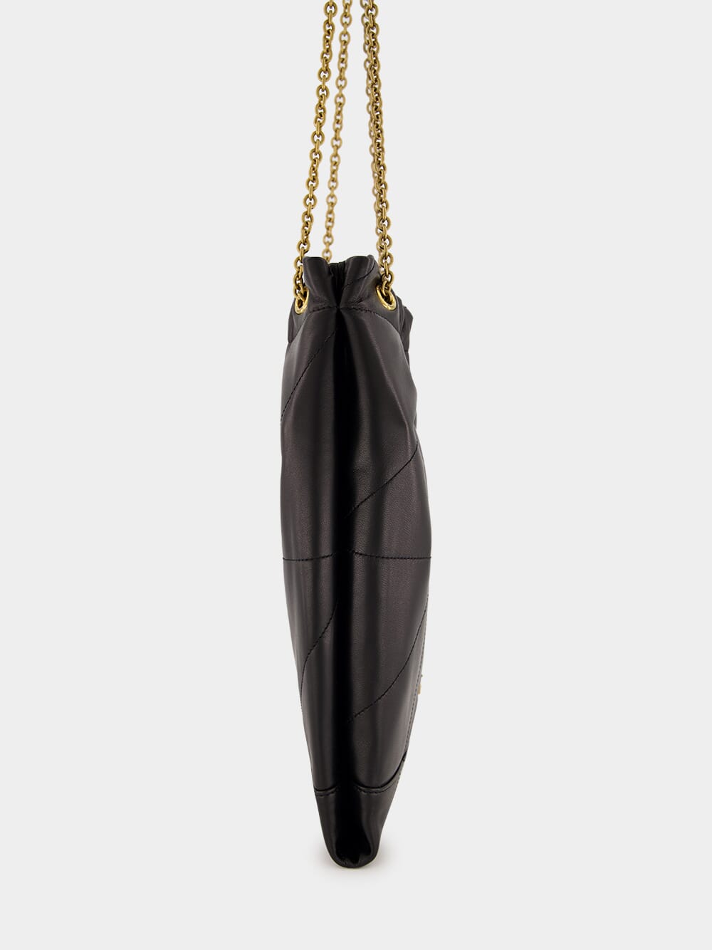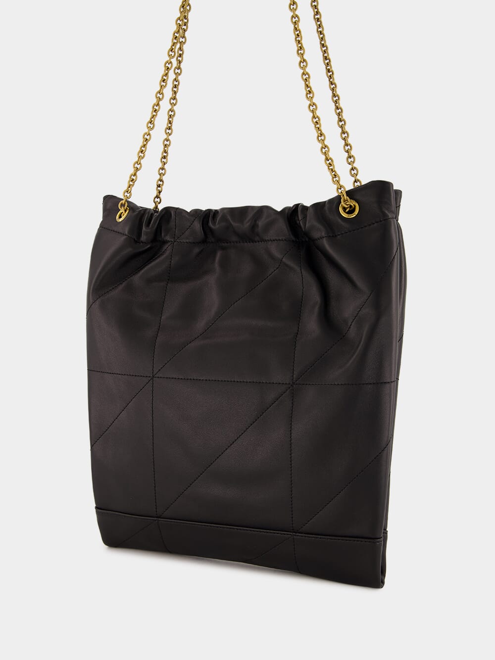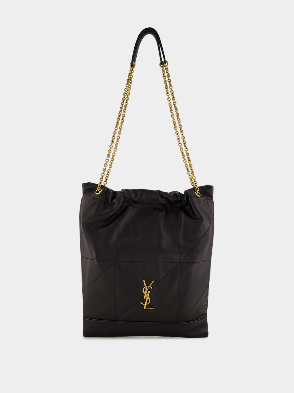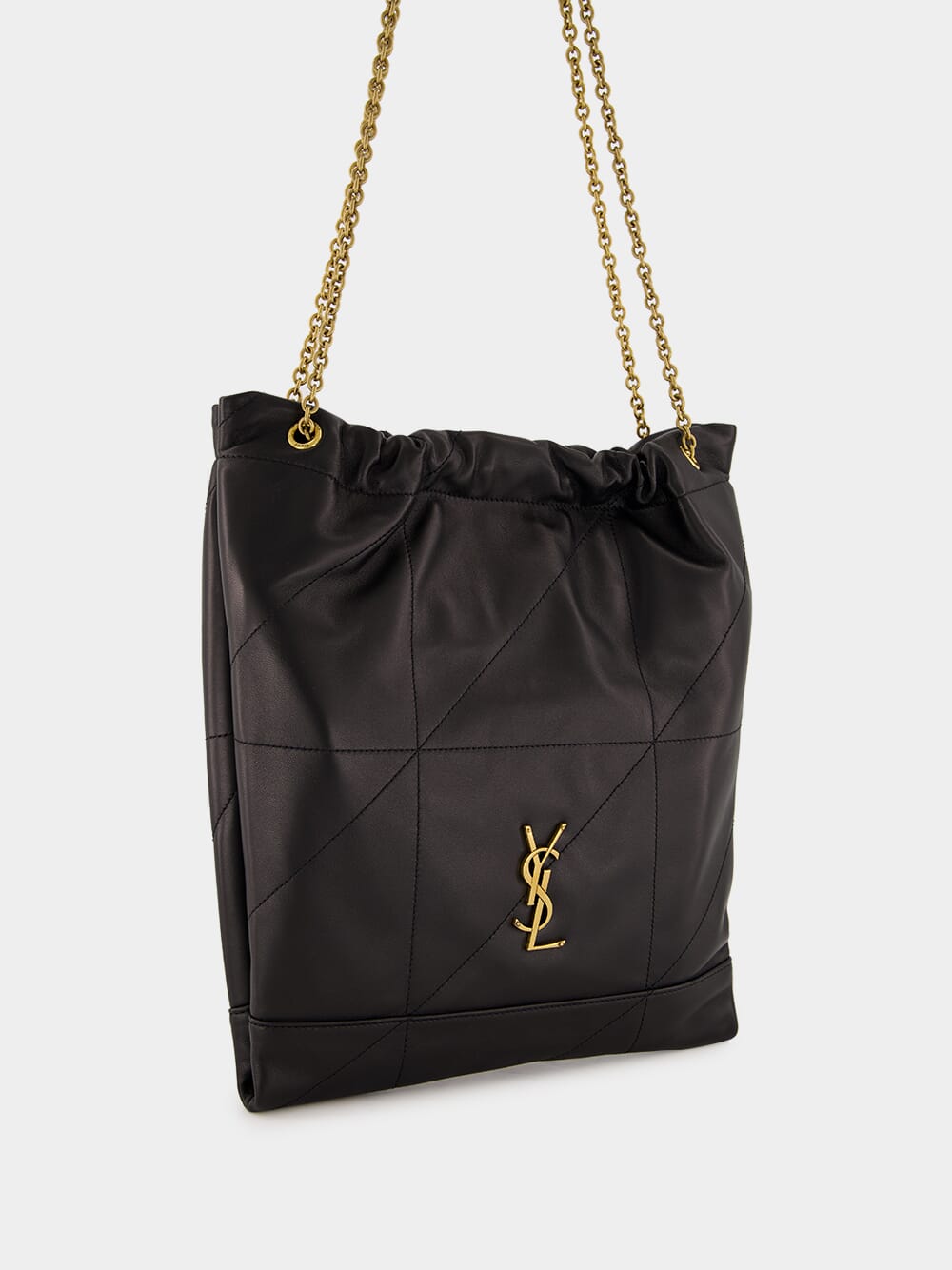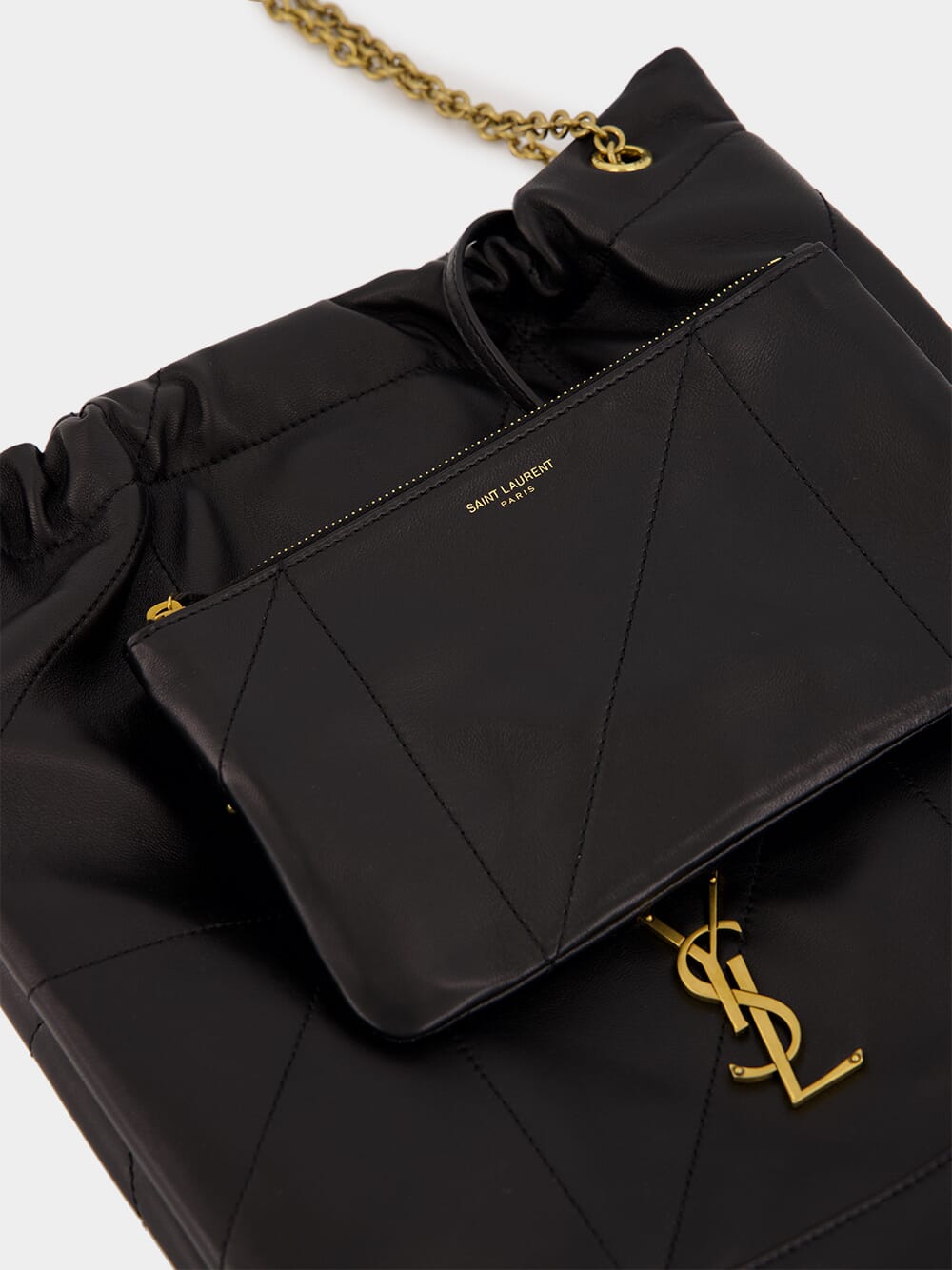 The Jamie Pochon by Saint Laurent is a sophisticated and functional accessory, crafted in supple black lambskin with carré rive gauche topstitching. This lightweight and spacious bag features a drawstring chain strap for adjustable carry options and a removable zip pouch for added versatility. Accented with bronze-toned hardware and lined in organic cotton, the bag combines luxury and practicality. A magnetic closure secures the design, making it an elegant choice for day-to-evening wear.