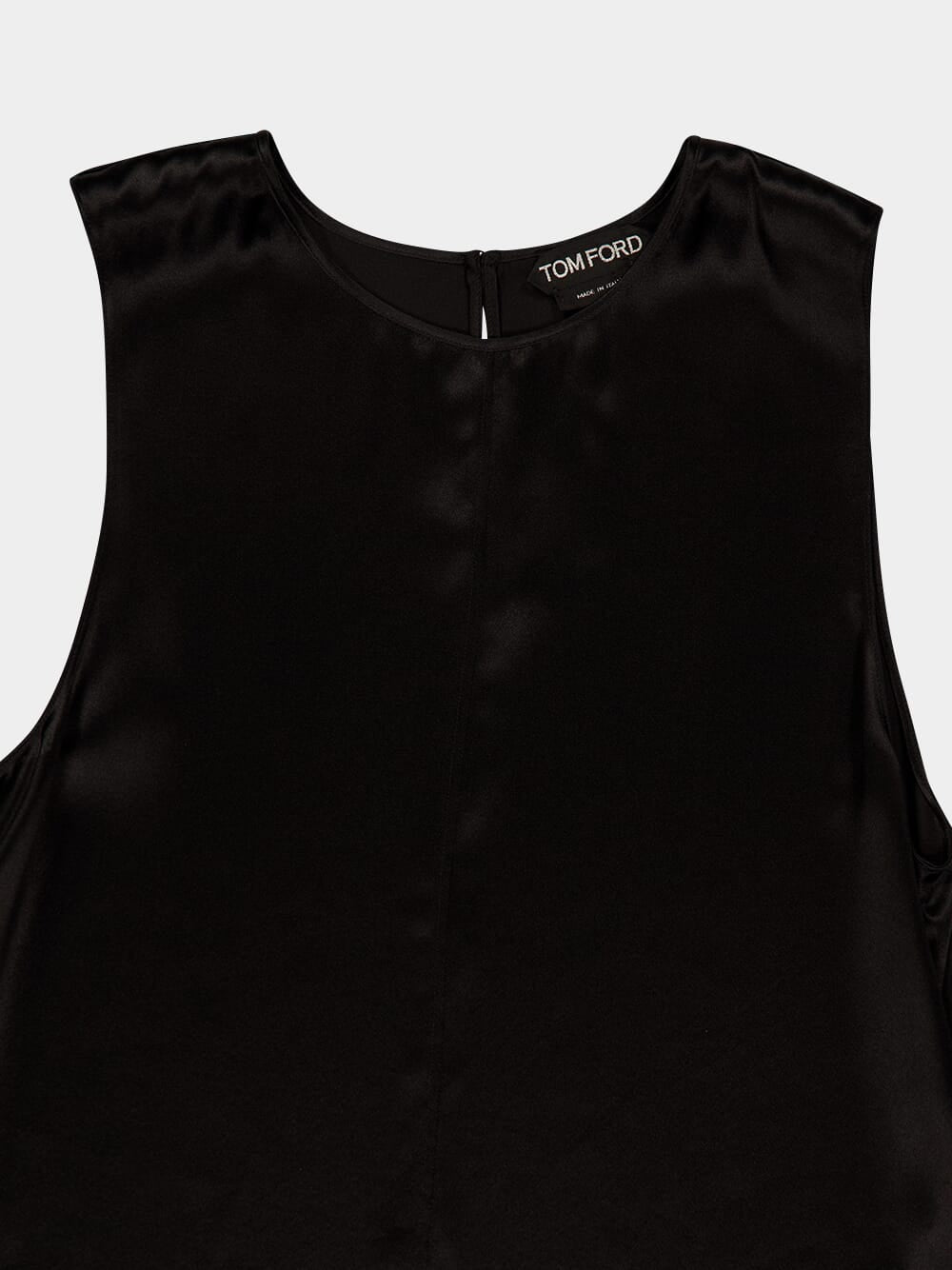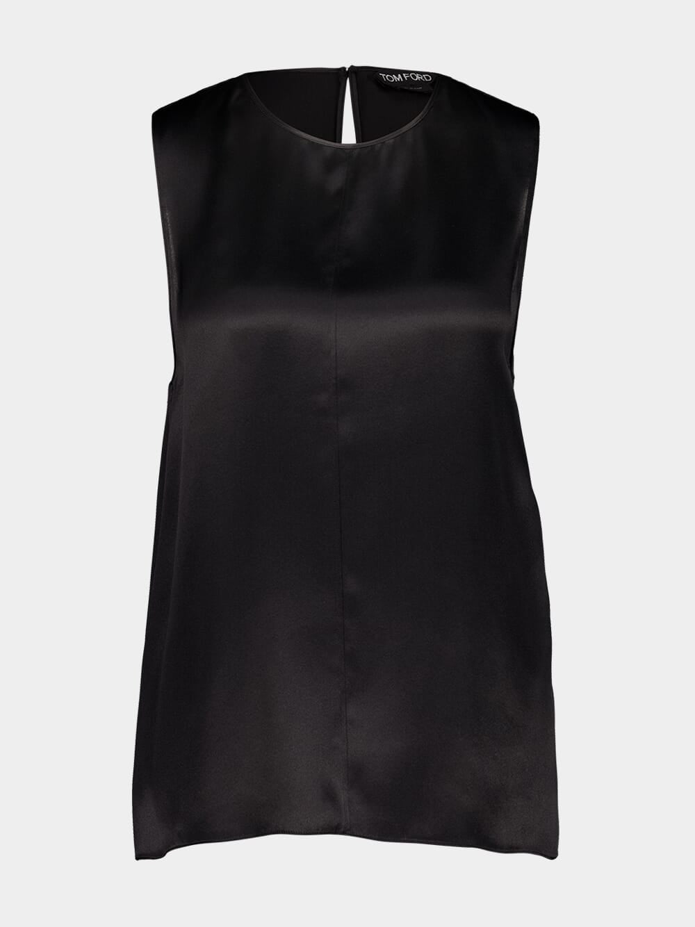 This Tom Ford sleeveless top is crafted from luxurious black silk charmeuse, offering a fluid and refined silhouette. With its minimalist design, it features a round neckline and a discreet keyhole fastening at the back, exuding understated elegance. Ideal for both casual and formal occasions, this versatile piece can be paired effortlessly with tailored trousers or skirts.
