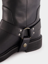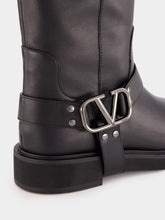 These Black Leather Biker Boots are a bold and sophisticated choice for any wardrobe. Crafted from premium black leather, these boots feature a round toe, mid-calf height, and a sturdy low heel, embodying both style and durability. The standout element is the silver-tone Valentino logo plaque on the side, paired with a sleek buckle strap, adding a luxurious touch to the rugged design. Perfect for adding an edge to both casual and elevated looks throughout the year.
