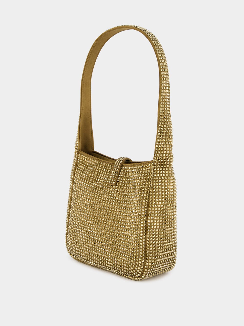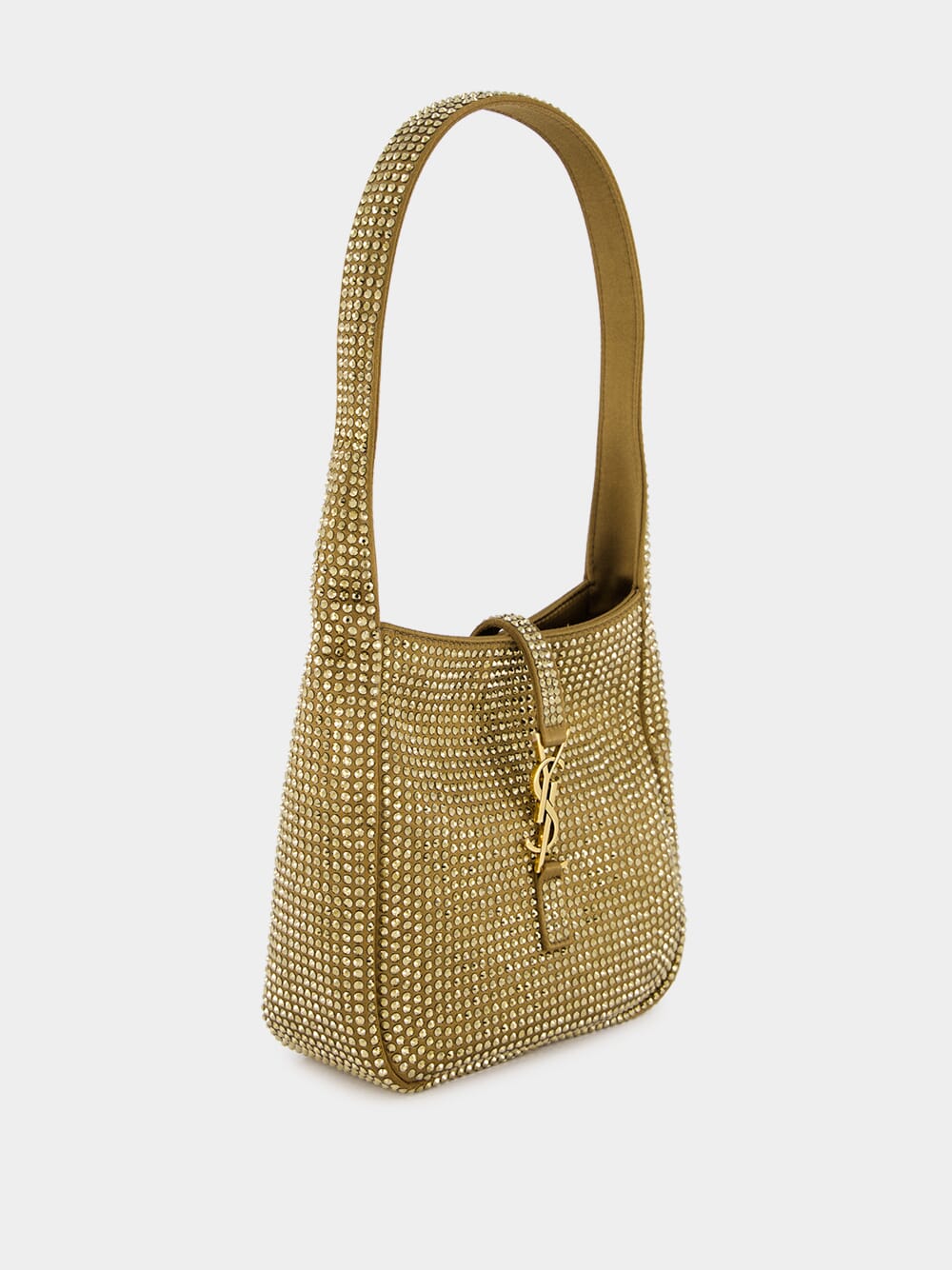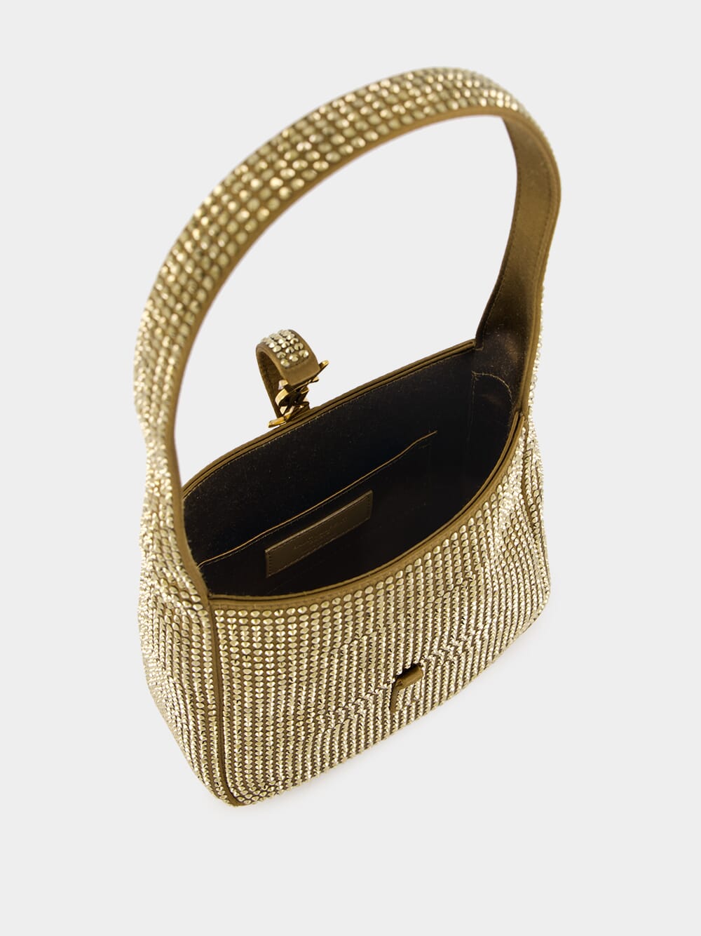 The Le 5 À 7 Baby Bag in brown is a sophisticated evening accessory, featuring a supple construction in rhinestone-adorned silk satin. It is defined by the iconic CASSANDRE-adorned leather tab closure and bronze-toned hardware, adding a touch of elegance. The bag is lined in luxurious silk satin, ensuring a refined interior. This versatile piece can be carried by hand or on the shoulder, making it perfect for any evening occasion. Made in Italy from certified viscose and silk, it embodies quality and style.