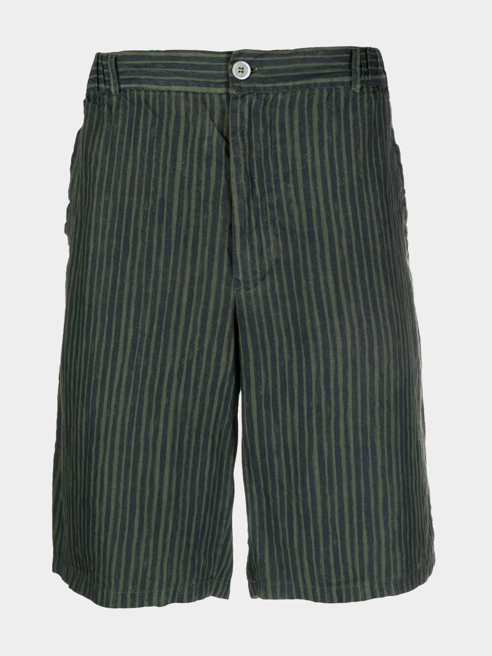 120% Lino army green linen shorts featuring belt loops, front button and zip fastening, two side slit pockets, rear welt pocket and above-knee length.