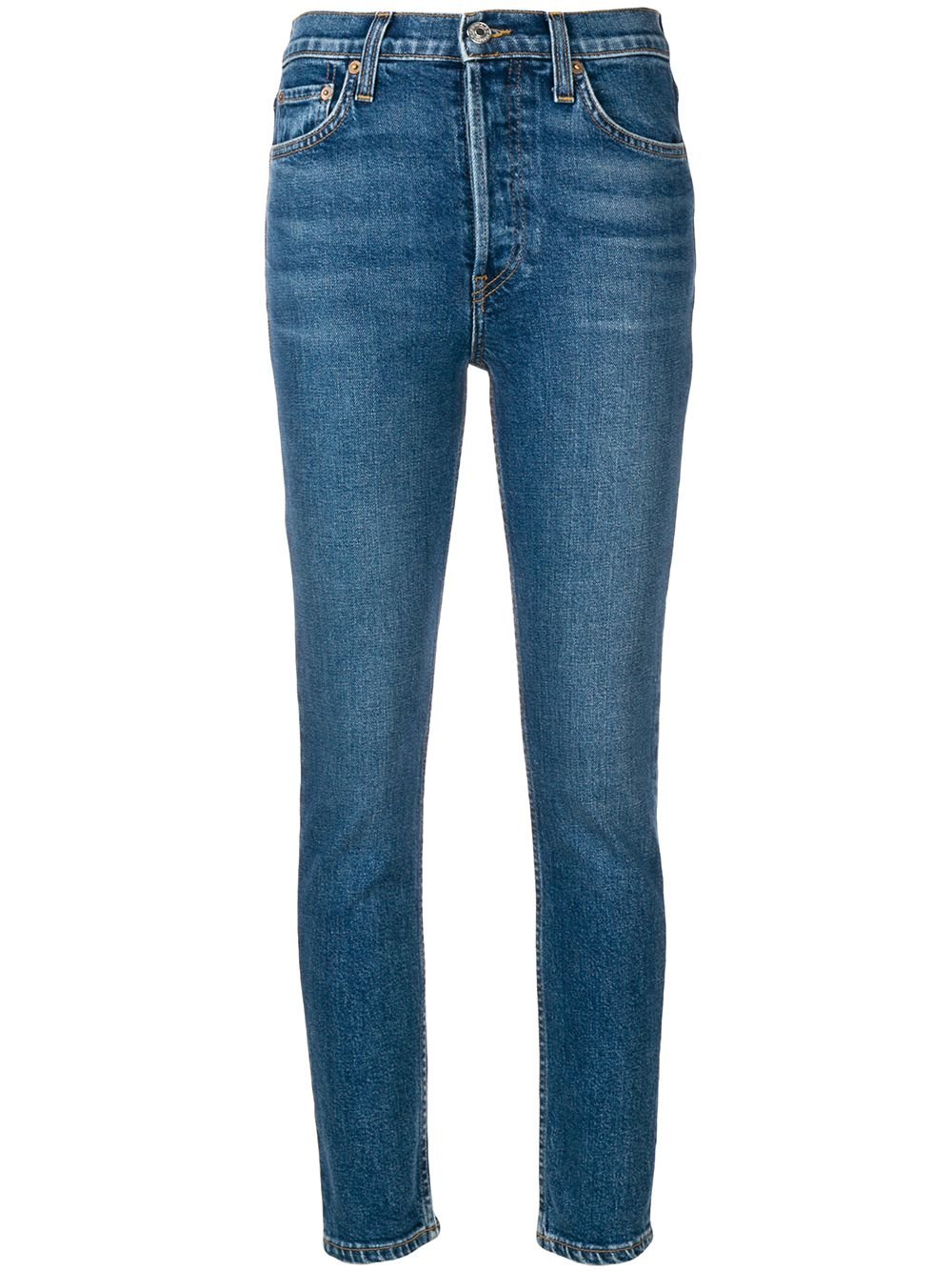 RE/DONE 70's dark blue cropped denim trousers with high waist and slim fit.