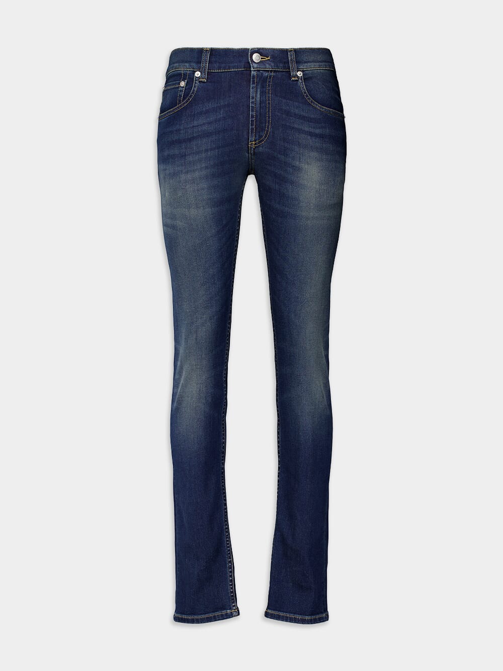 Graffiti Denim Jeans in Washed Blue, a perfect blend of style and streetwear influence. These slim-fit jeans are crafted from blue washed stretch denim, offering a comfortable and flattering fit. They feature an embroidered McQueen Graffiti signature, adding a unique and edgy touch to your look. With tobacco top-stitching, these jeans showcase impeccable attention to detail.