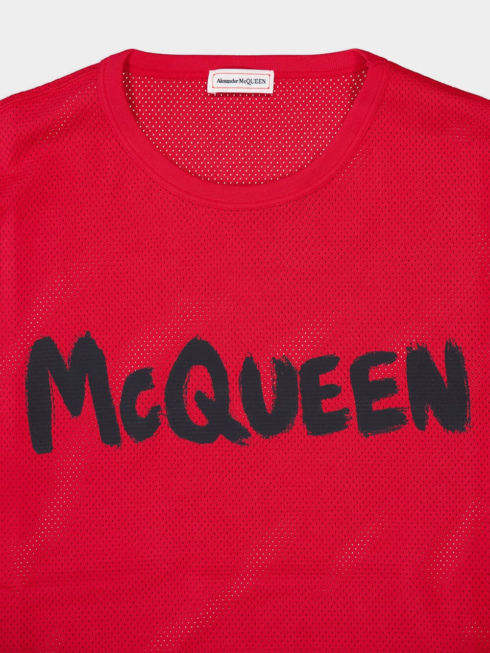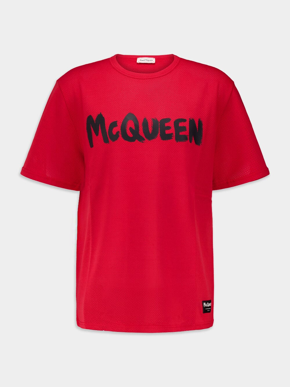 ALEXANDER MCQUEEN Graffiti T-Shirt crafted with premium cotton, this t-shirt offers a soft and breathable feel, perfect for all-day wear. The striking graffiti design in bold red hues adds an energetic and artistic touch to your outfit. With its classic fit and versatile red color, this t-shirt effortlessly blends style and versatility.
