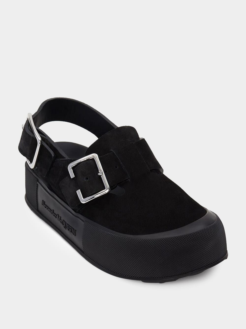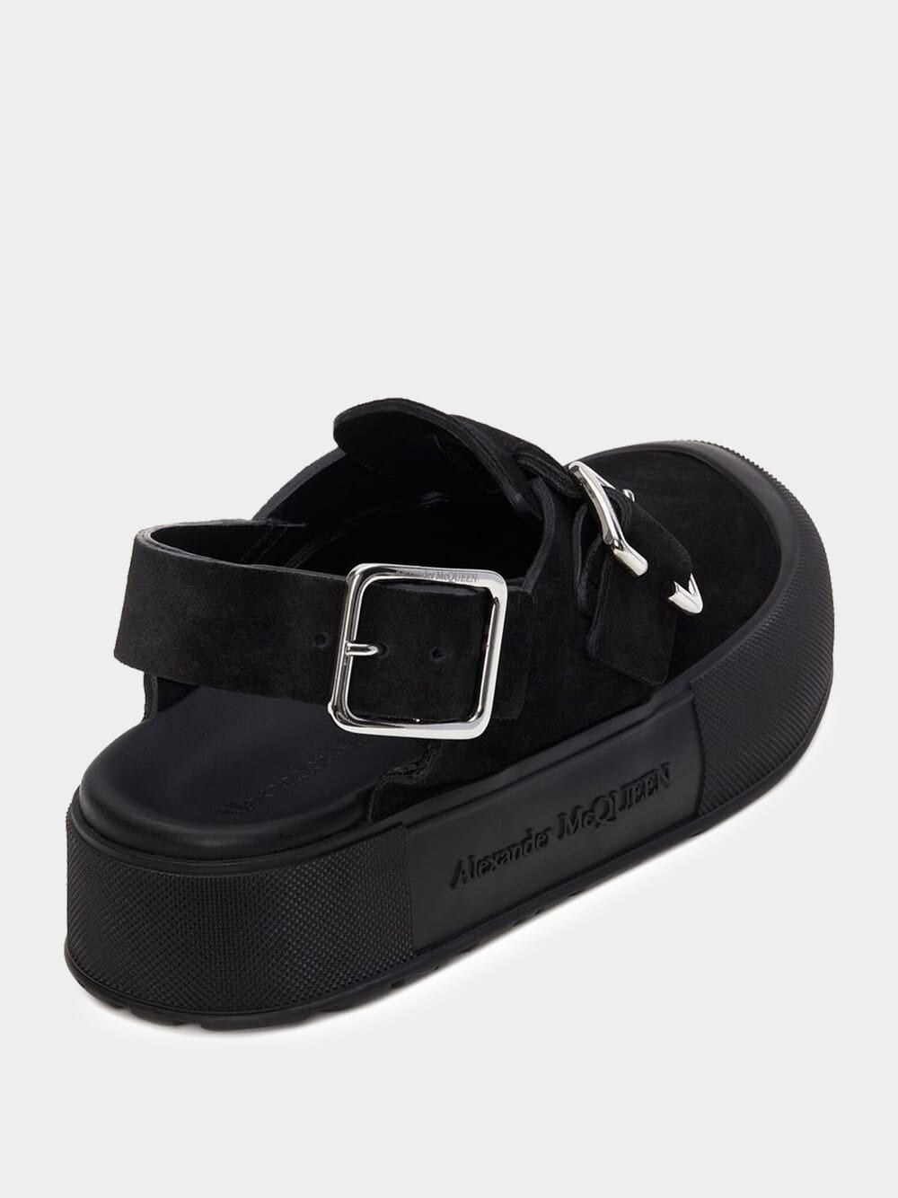 Alexander McQueen men's Mount Slick Sandals in black suede featuring raw edges and an exaggerated stacked sole with an embossed Alexander McQueen signature. The silver-finished buckles are detailed with a lasered Alexander McQueen logo.