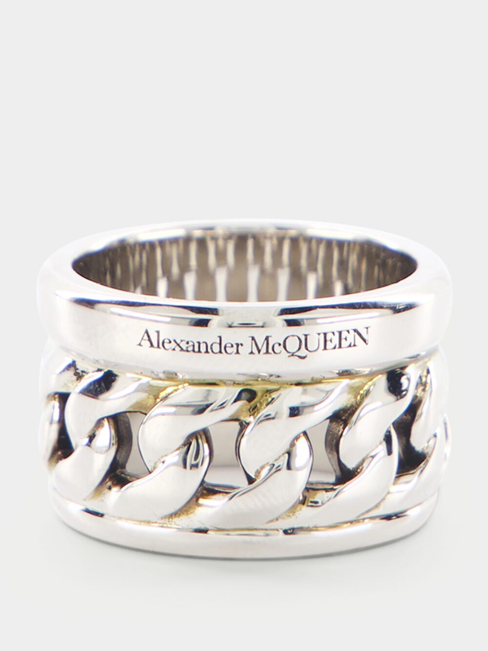 Logo detail silver-tone ring crafted with meticulous precision, this ring features a sleek silver-tone band adorned with an intricately designed logo detail. The brass accents add a touch of warmth and contrast, elevating the overall aesthetic. With its impeccable craftsmanship and adjustable fit, this ring effortlessly adds a touch of elegance and sophistication to any ensemble.