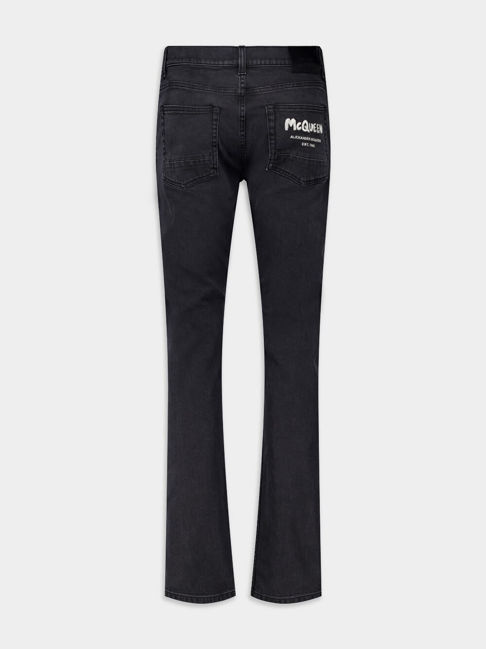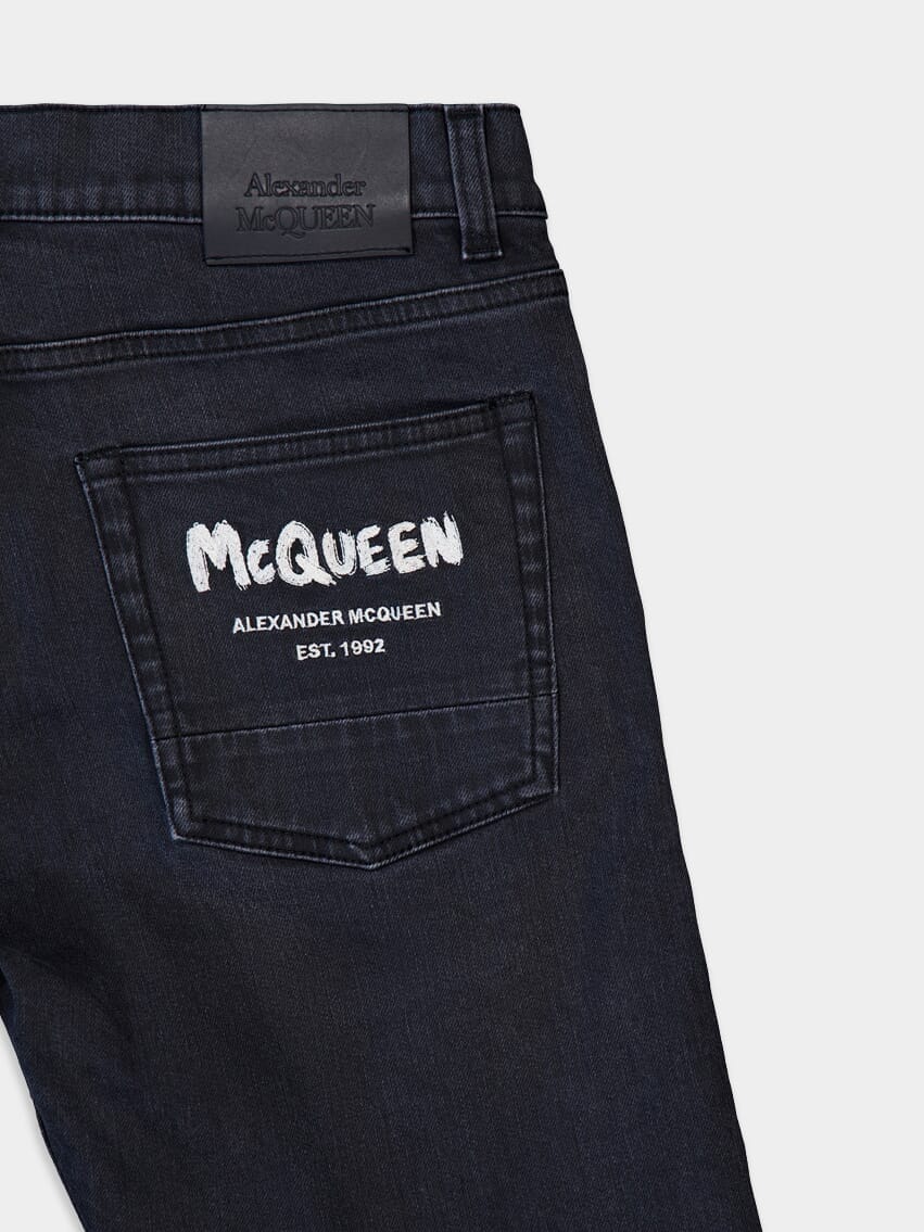 McQueen Graffiti Denim Jeans in Black, a perfect fusion of style and urban flair. These slim-fit jeans are crafted from black denim, offering a sleek and versatile look. They feature an embroidered McQueen Graffiti signature, adding a touch of edginess and artistic expression.