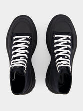 These black canvas lace-up boots from Alexander McQueen redefine rugged elegance with their oversized rubber tread sole. Detailed with a textured rubber wrap and the tonal McQueen signature, these boots are a stateMent of bold style. The silhouette is defined by a round toe and rubber toe cap, completed with the brand's signature ribbon at the back.