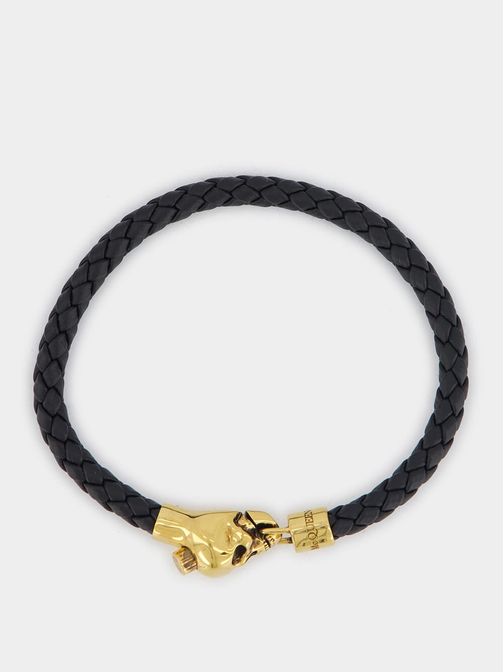 Skull Braided Leather Bracelet, crafted for style and durability, this bracelet features a braided band that exudes a modern edge. The gold-tone hardware and engraved logo add a touch of luxury. The standout skull charm enhances the bracelet's uniqueness. With a secure clip fastening, this piece seamlessly combines fashion and function.