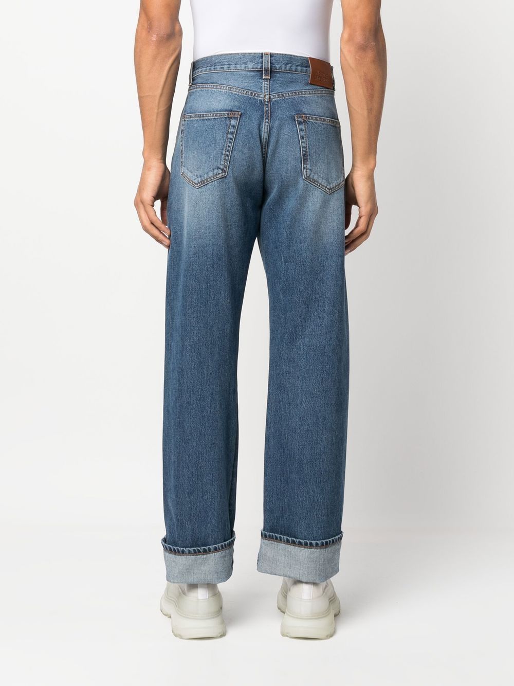 Alexander McQueen men's Turn-up jeans in washed blue japanese selvedge denim with baseball stitch detailing over the side seams, featuring belt loops, a five-pocket design and turn-up cuffs.