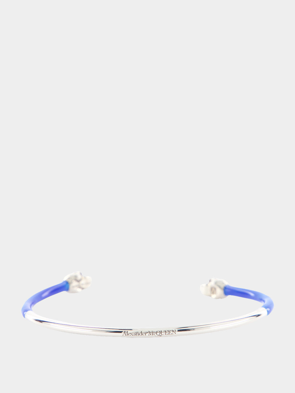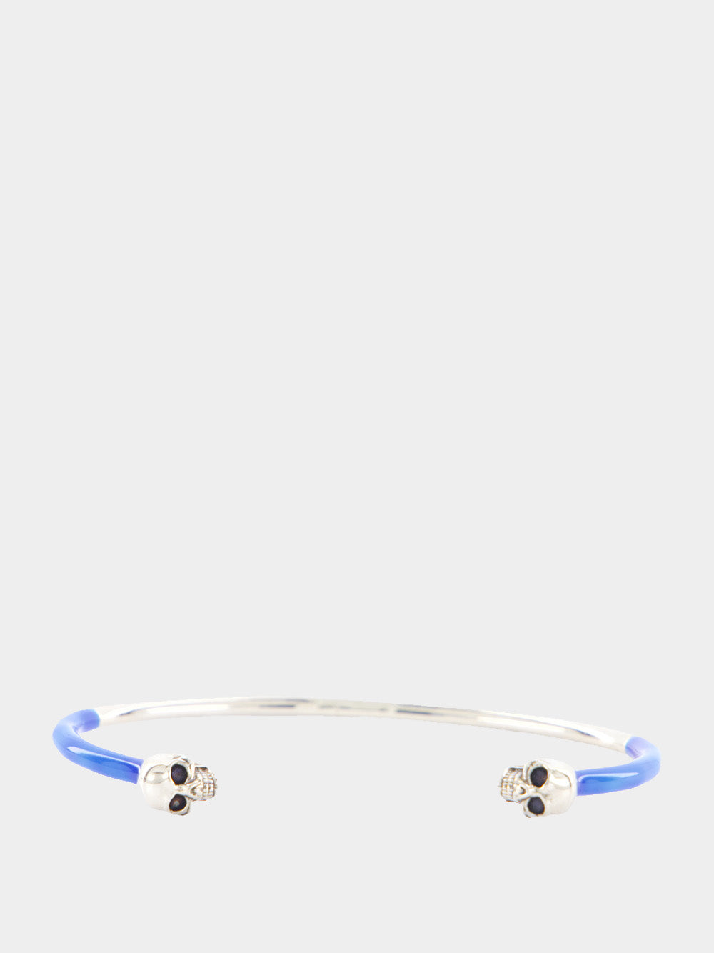 ALEXANDER MCQUEEN Thin Twin Skull Bracelet crafted with meticulous precision, this bracelet features a sleek silver chain adorned with twin skull charms. The striking blue detailing adds a touch of boldness, while the brass accents provide an edgy contrast. With its adjustable design and comfortable fit, this bracelet effortlessly complements any outfit, adding a hint of rebellious sophistication.