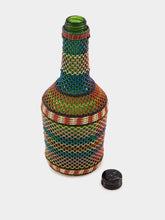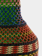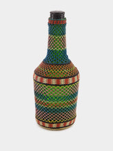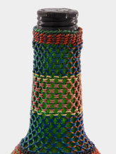 This 23.4cm glass flask is wrapped in a delicate net-style woven design, combining intricate craftsmanship with vibrant colors. The green glass bottle is encased in an artful mix of red, blue, and beige threads, creating a striking visual contrast that adds texture and depth to any space. Ideal for adding a touch of global-inspired décor, this flask makes a perfect statement piece for shelves, tables, or curated collections. Its handcrafted quality brings both uniqueness and charm to any interior.