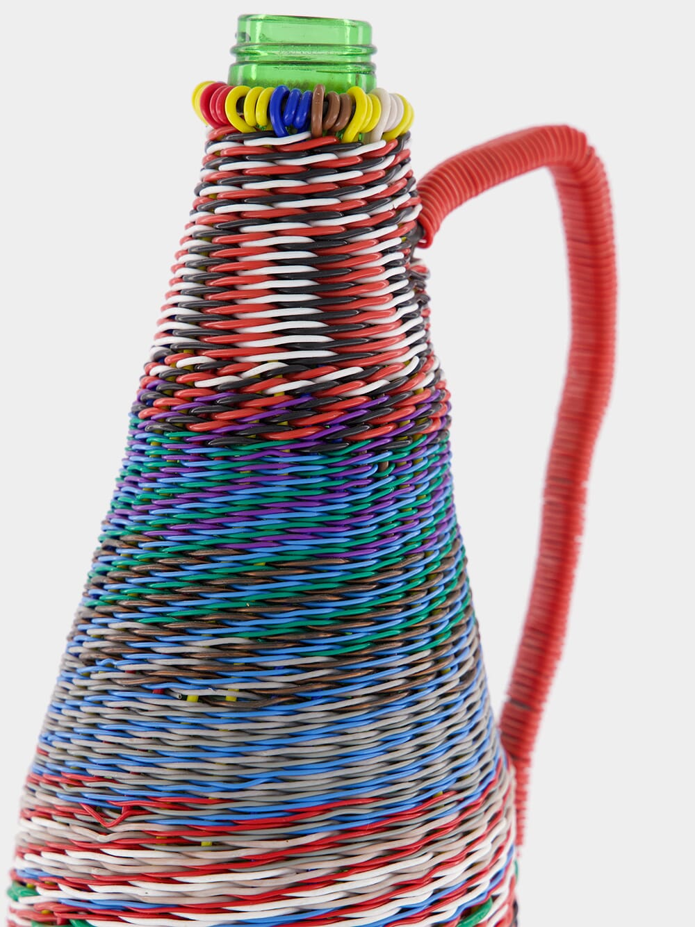 The Woven Glass Flask is a vibrant and unique piece, perfect for adding a splash of color to your home decor. Featuring a glass body encased in a multicolored woven design, it combines functionality with artistic flair. Ideal for serving beverages or as a decorative item, it brings a lively touch to any setting.