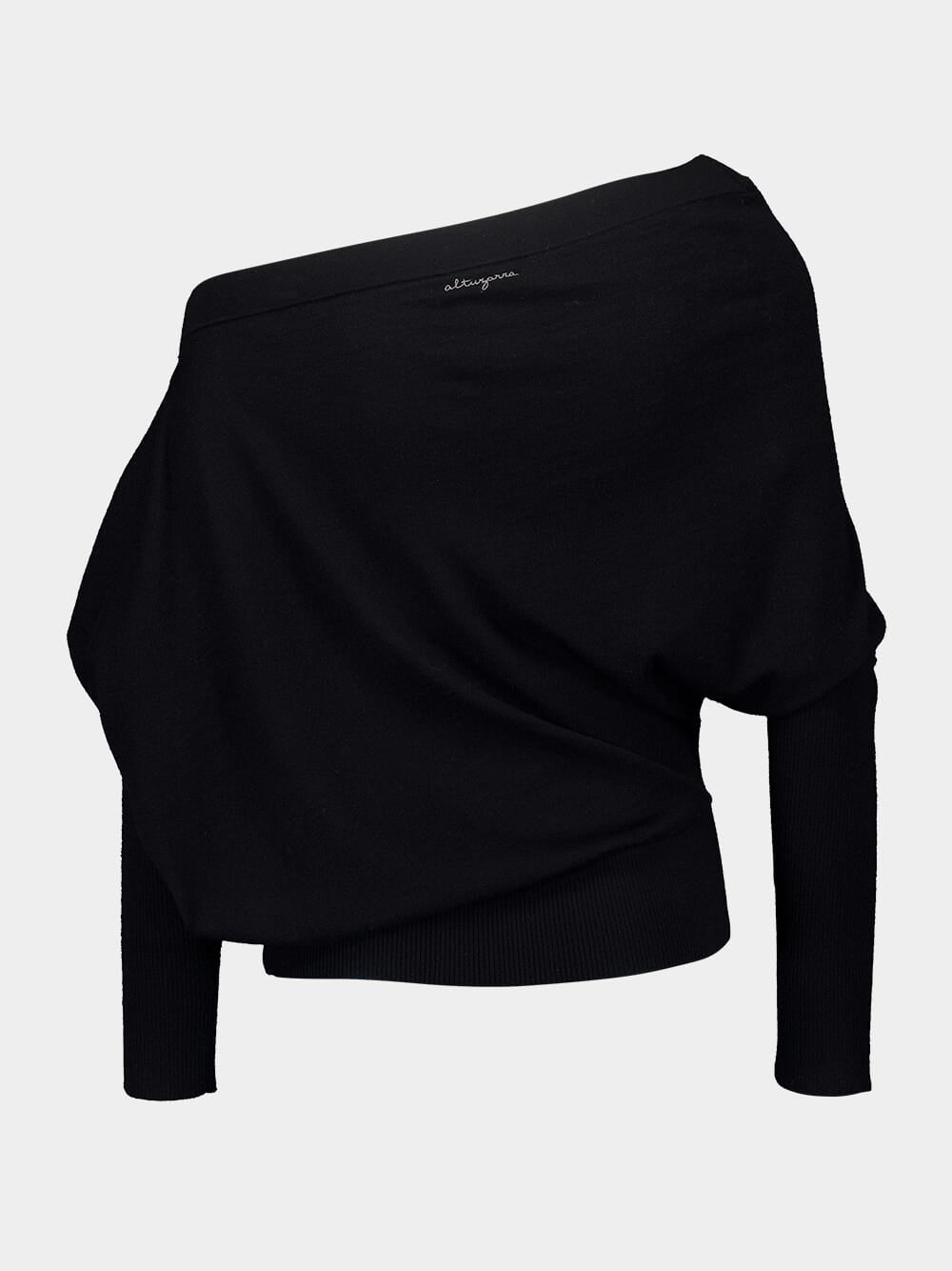 The Black Grainge Sweater accentuates the feminine figure with its sleek design. Crafted from lightweight pure cashmere, it features long, slender sleeves and a sensuous off-the-shoulder style. Perfect for any season, this luxurious sweater combines comfort and elegance, making it a versatile addition to your wardrobe. Its refined aesthetic ensures you stay stylish whether dressing up or down.