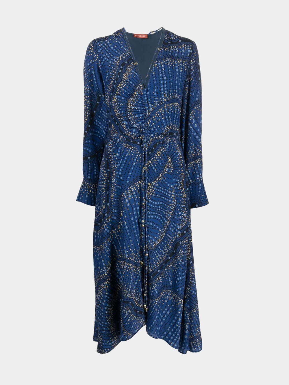 Altuzarra Mila pure silk midi dress featuring long sleeves, ruched details and v neckline.
