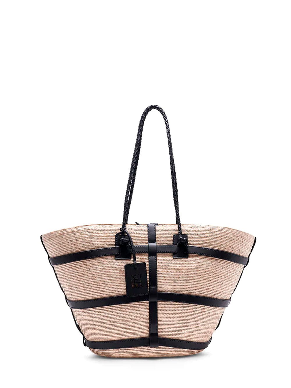 Altuzarra Watermill small shoulder bag in natural and black vegan leather. Featuring two slim braided handles, a self-tie closure and a vegan leather tag with Altuzarra logo. Each bag is woven by hand and may have slight variations in shape.