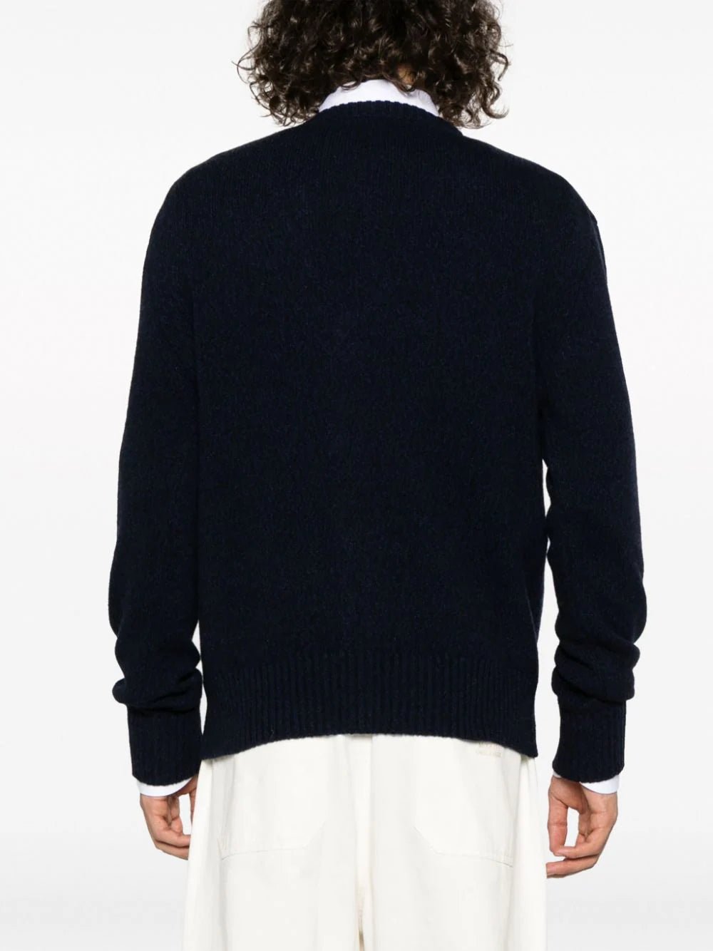 Midnight Blue Cashmere and Wool V-Neck Cardigan. Crafted from a sumptuous cashmere-wool blend, this cardigan is both warm and stylish. Featuring long sleeves and a front button fastening, it's the perfect blend of comfort and elegance. The straight hem adds a tailored touch to this classic piece.