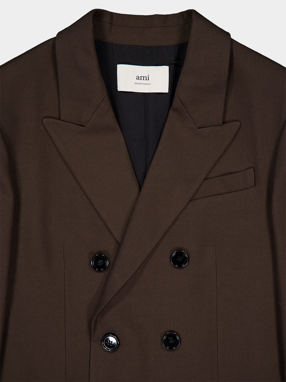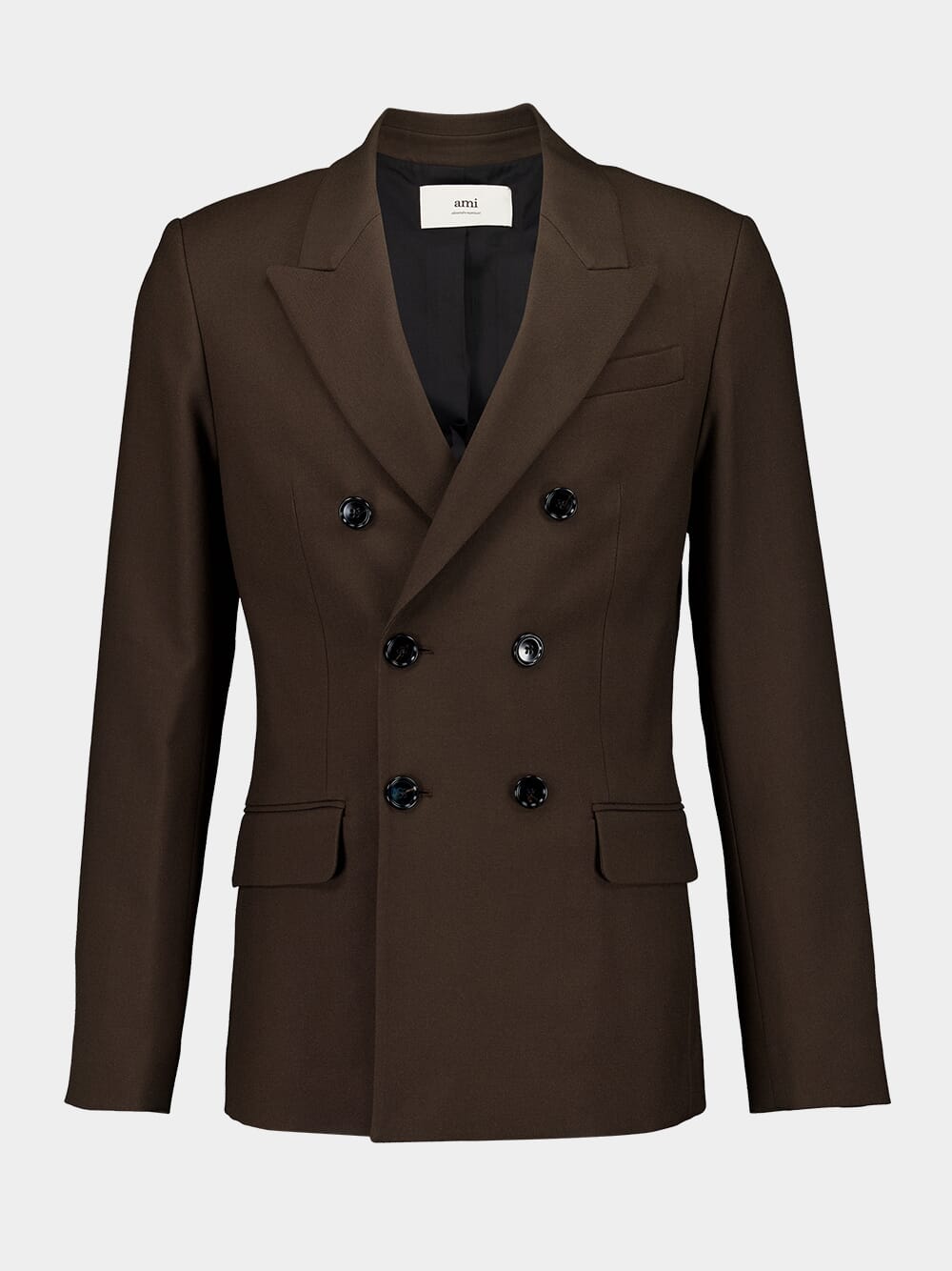 This double-breasted jacket is crafted from soft wool gabardine and features a regular fit. The jacket is lined and includes a peak collar, welt chest pocket, flap pockets, inside pockets, double slits on the back, and buttoned bottom sleeves. It is finished with elegant horn buttons.