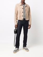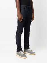 Ami Paris dark blue denim straight trousers with contrasting stitching and black leather embossed logo label on back.