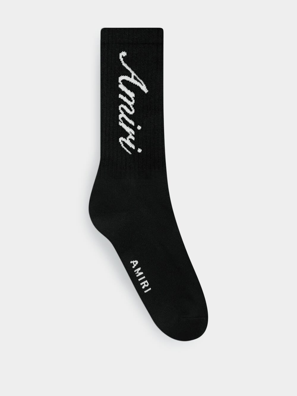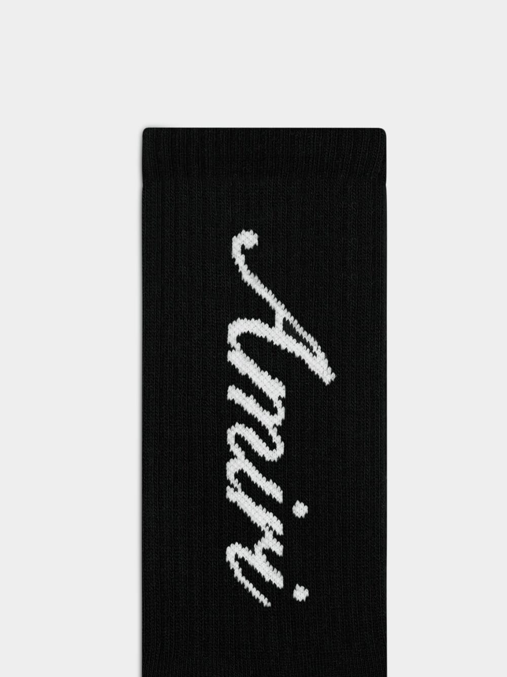 Amiri Script Tube Sock, crafted from resilient ribbed cotton, this sock not only exudes durability but also adds a decisive element to complete your look. The distinctive Amiri cursive logo, boldly presented in contrasting black and white, effortlessly captures attention.