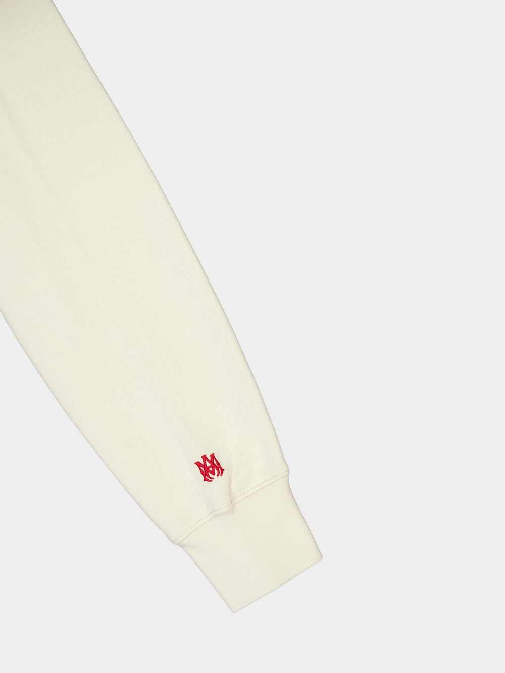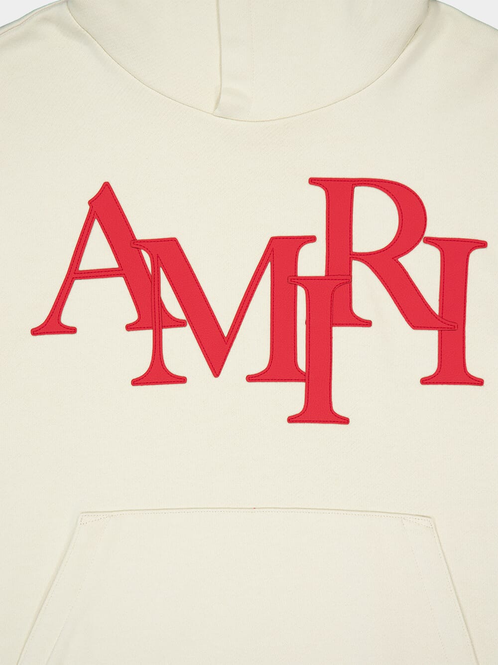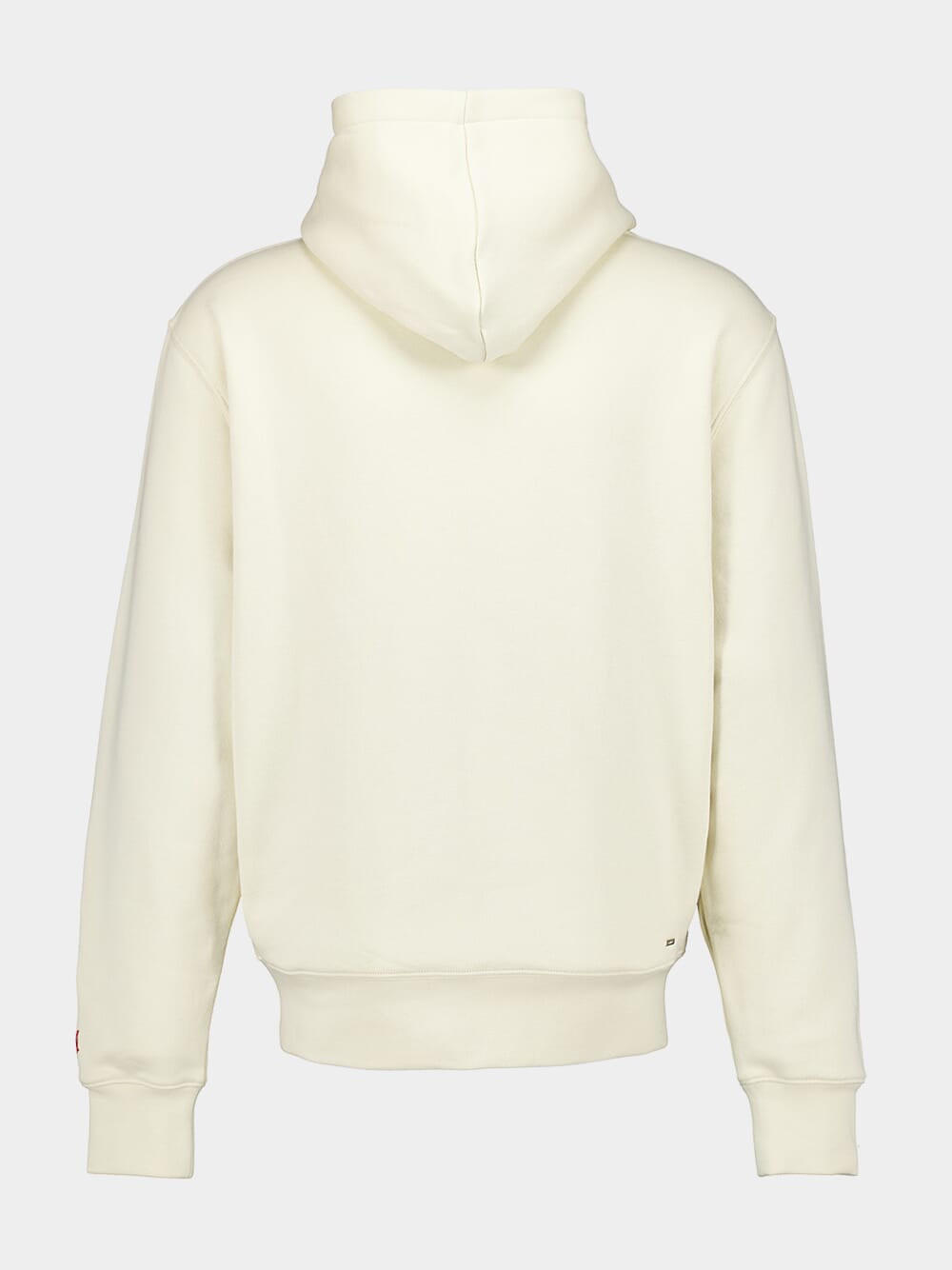 This light beige cotton hoodie features a striking red staggered logo appliqué on the front. Crafted from soft cotton with a jersey texture, it includes an embroidered logo on the sleeve, a classic hood, long sleeves, and ribbed cuffs and hem. The front pouch pocket and French terry lining add comfort and functionality. Perfect for a stylish and cozy look.