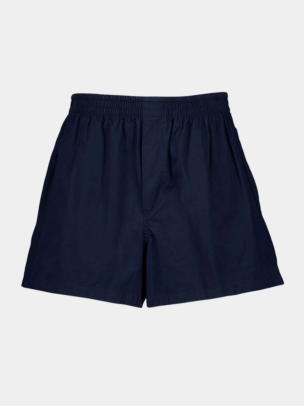 These versatile dark blue boxer shorts are crafted from premium cotton poplin, designed to be unisex. Featuring a mid-waist cut, elasticated waistband, and a covered zip fly, they offer both style and comfort. The shorts also include two zipped slash pockets and an above-the-knee length, making them perfect for casual wear in any season.