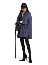 Balenciaga shirt mini dress crafted in faded blue washed papery poplin. Features a button-down collar, asymmetric button placket, and long sleeves. The elasticated waistband creates a cinched silhouette. Over-the-knee length design.