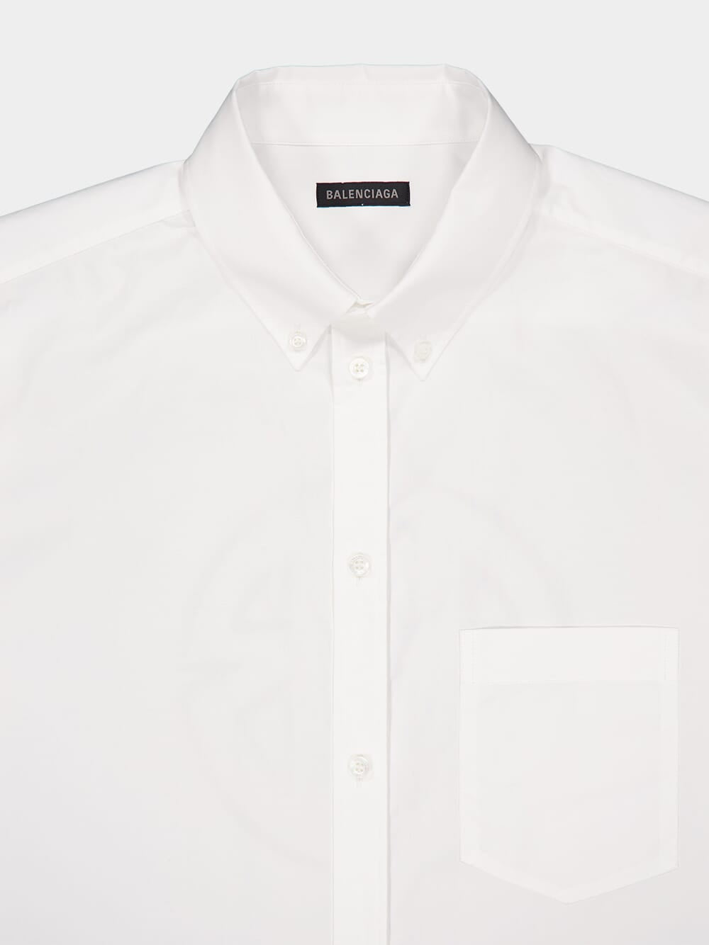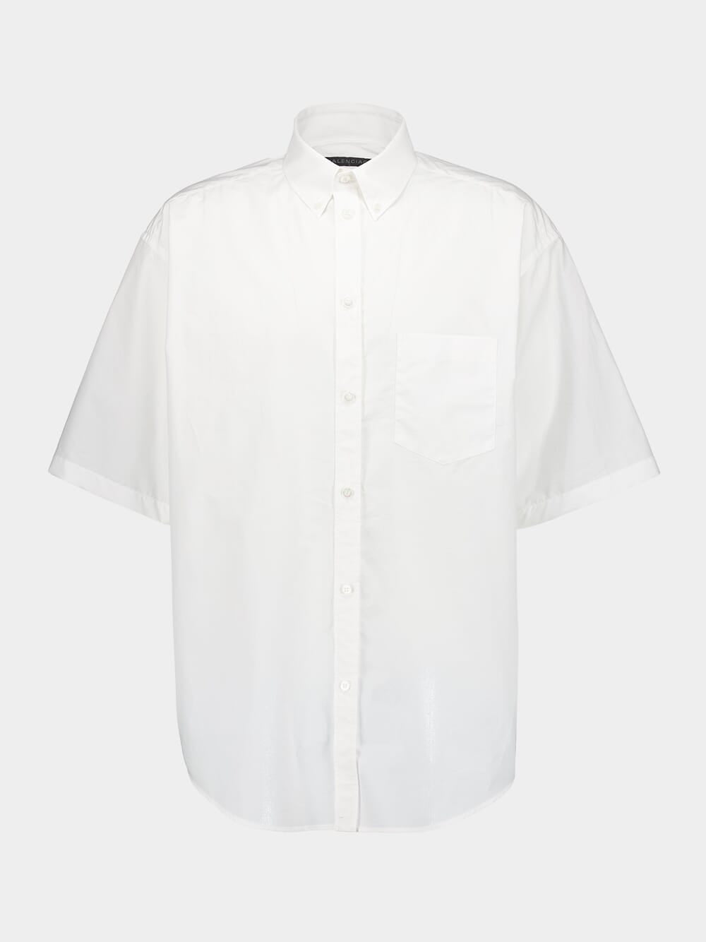 This white short-sleeved shirt combines classic design with contemporary details. Crafted from premium cotton, it features a button-down collar, front button fastening, and a practical chest patch pocket. The curved hem adds a touch of sophistication, while the graphic logo print on the rear provides a stylish accent.