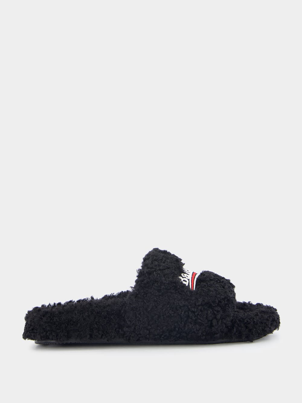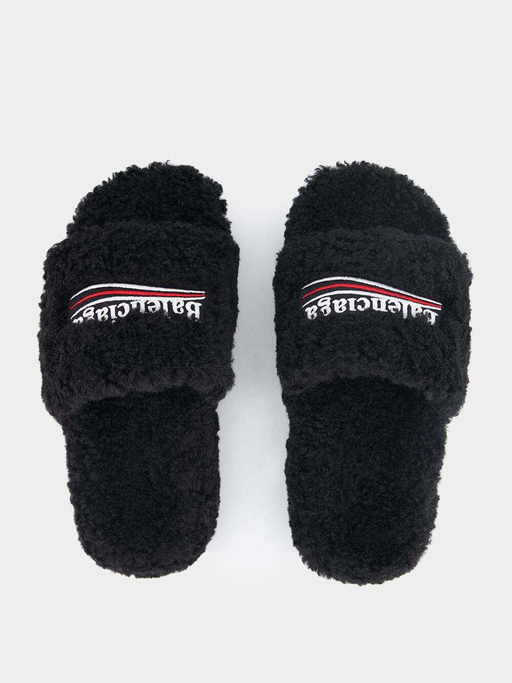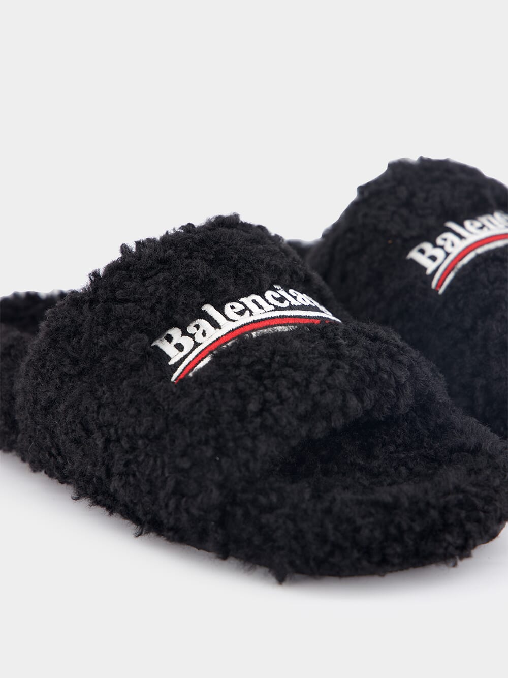 Furry Slide Sandal, crafted with high-quality fake shearling, these slide sandals offer a soft and plush feel. The Embroidered Balenciaga Political Campaign logo adds a touch of sophistication and elegance. With a tone-on-tone sole and black outsole, these sandals showcase impeccable craftsmanship and design.