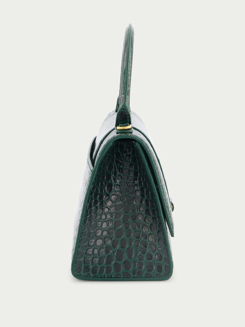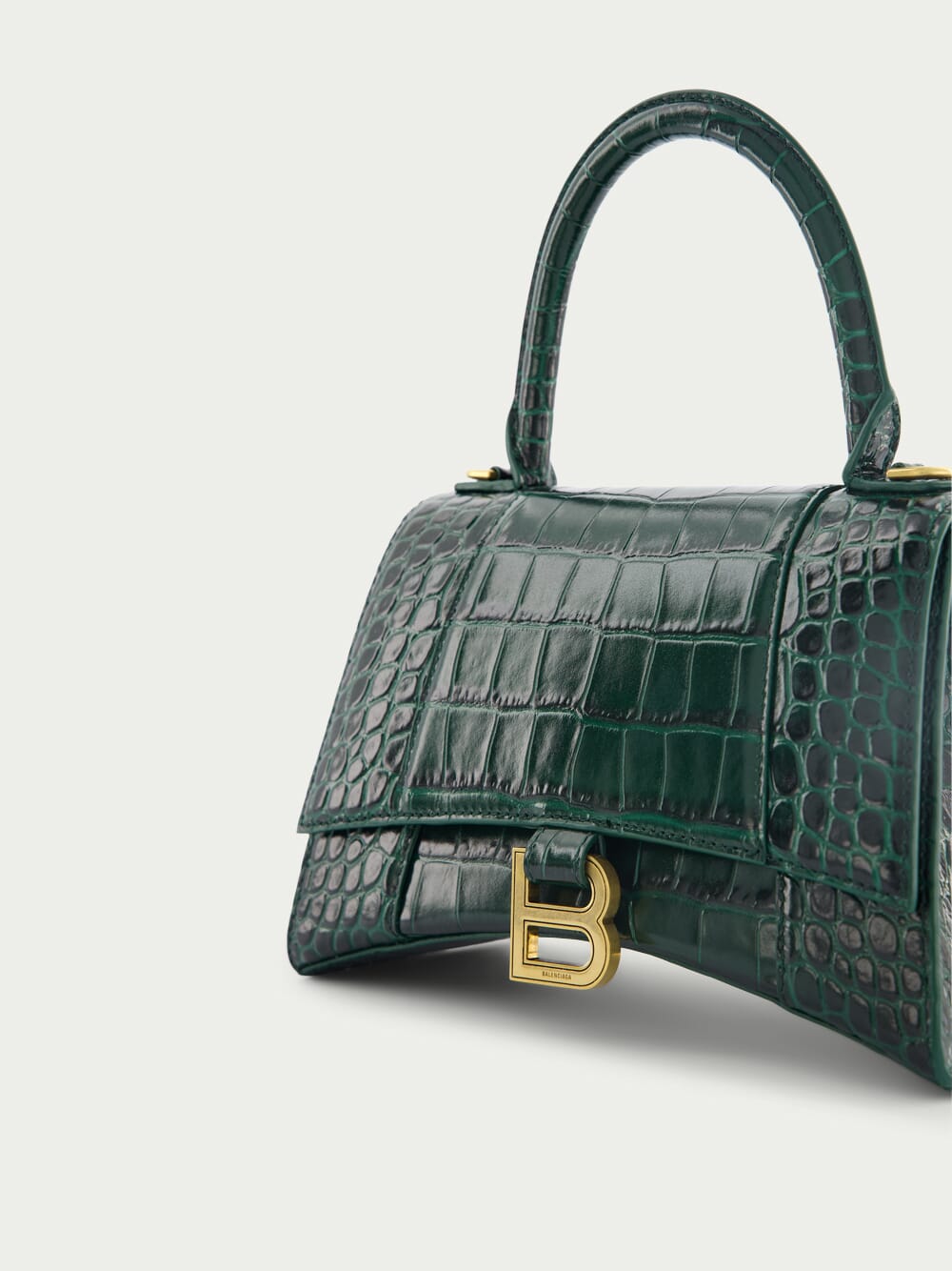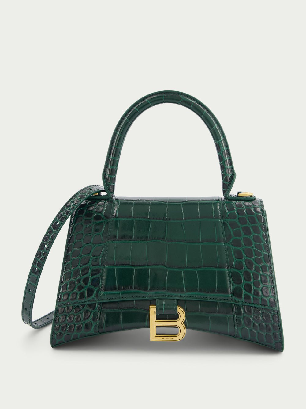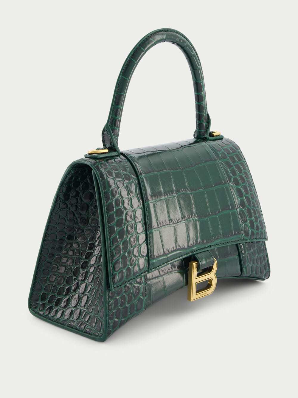 Balenciaga Hourglass small handbag made with panels of glossed croc-effect leather in forest green, featuring an hourglass shape of curvilinear base and decorated with a burnished gold-tone 'B' logo, with an adjustable and removable crossbody strap.