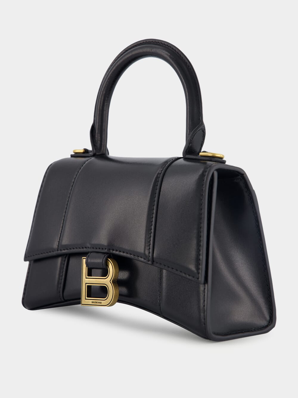Hourglass XS Handbag Box, crafted from shiny box calfskin, this handbag boasts a sleek and polished look. The hourglass shape and curvilinear base make a bold style statement. With a long flap and an adjustable, removable crossbody strap, you can carry it with ease and versatility. The bag features a convenient handle and a magnet closure adorned with an aged-gold B logo (brass), adding a touch of luxury. The back pocket offers additional storage options, while the nappa lambskin lining provides a soft and plush interior.