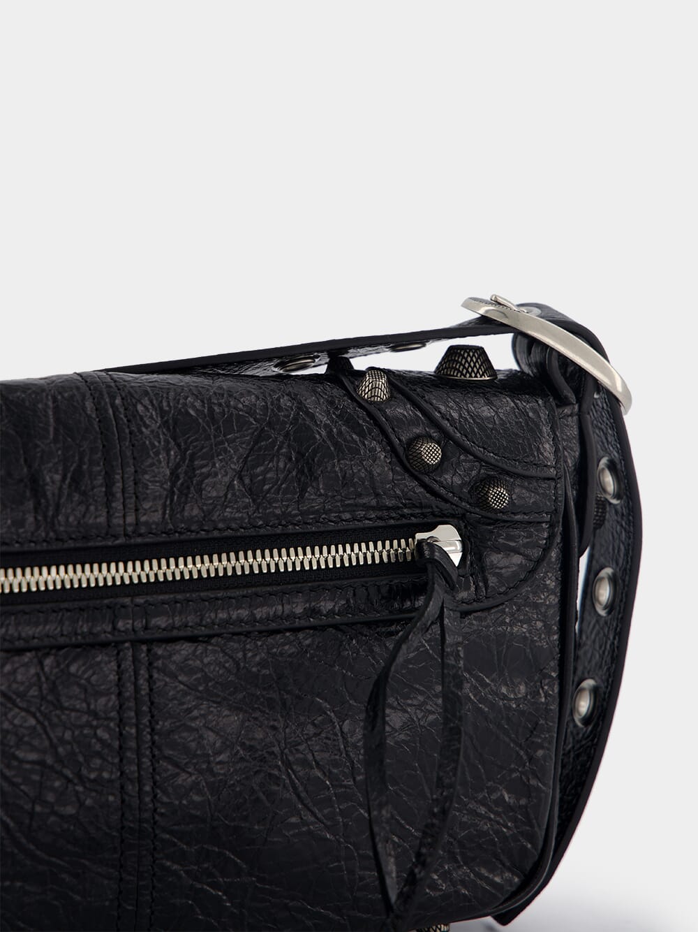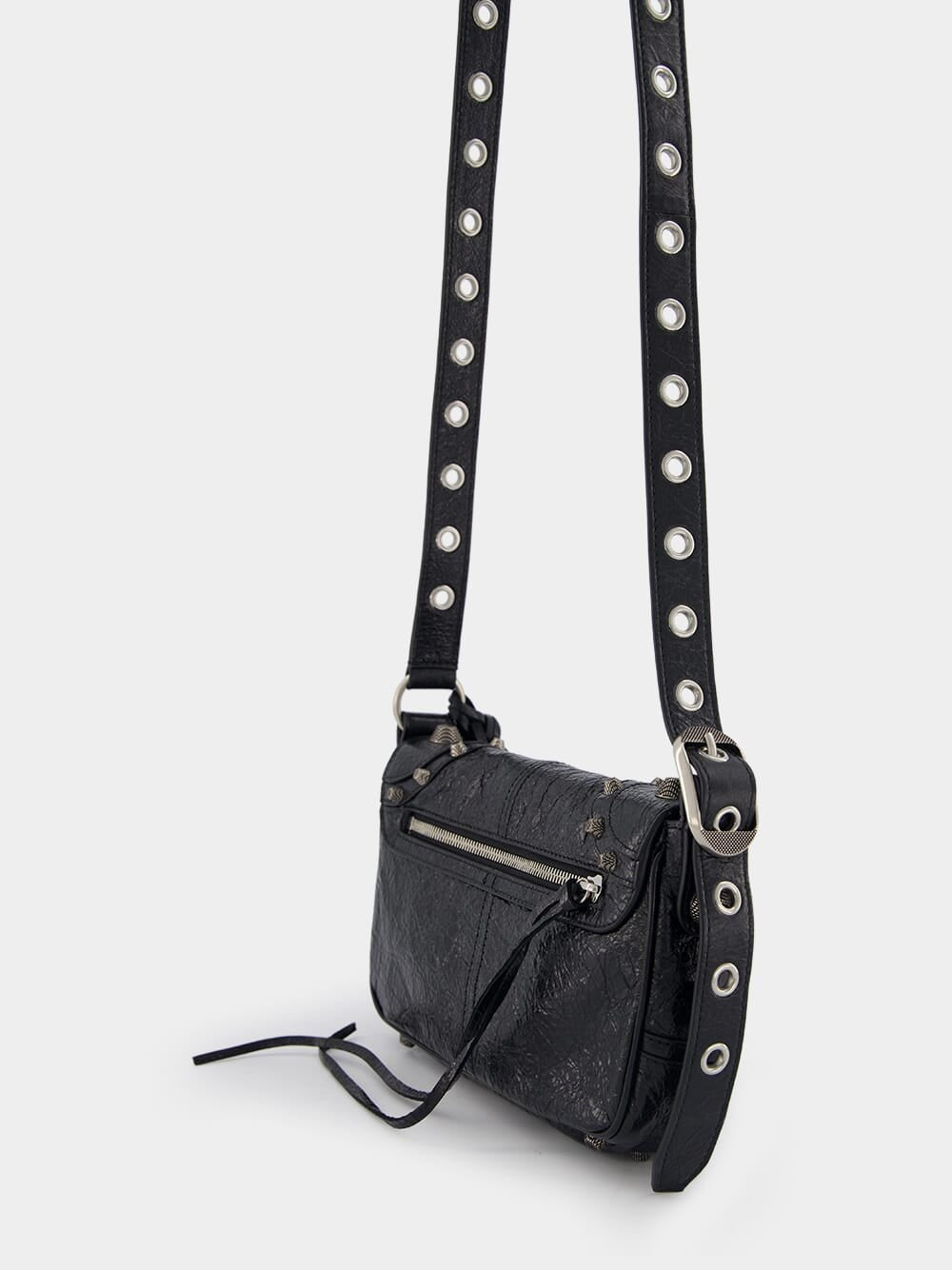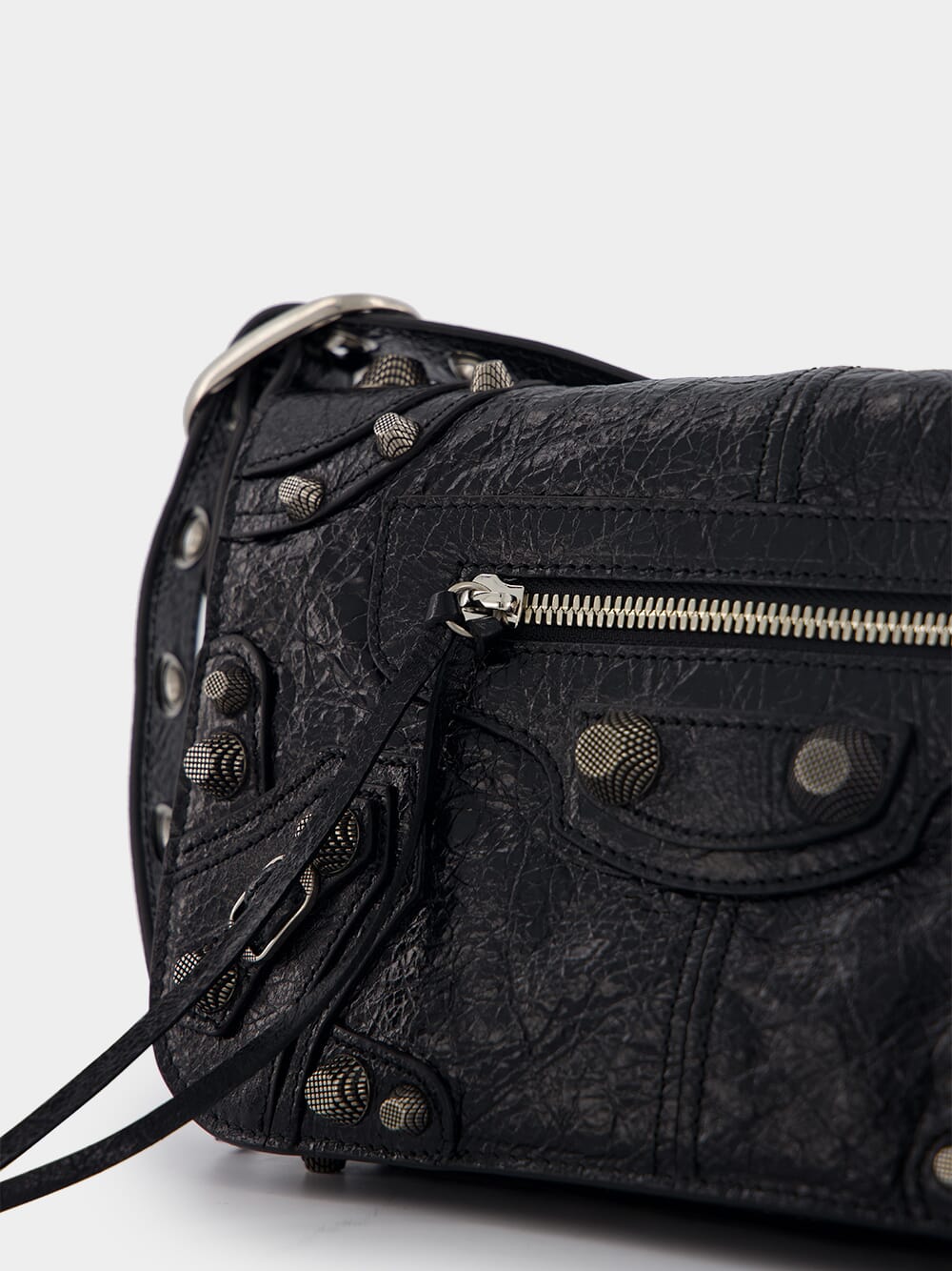 Le Cagole Men XS Flap Bag crafted for urban living, this flap bag features an adjustable strap with a leather braided shoulder pad for comfort. The aged-silver hardware, front zipped pocket, and flap closure with magnet add modern flair. With convenient inner and back pockets, plus a removable zipped pouch and EarPods holder, this bag effortlessly complements your on-the-go lifestyle.
