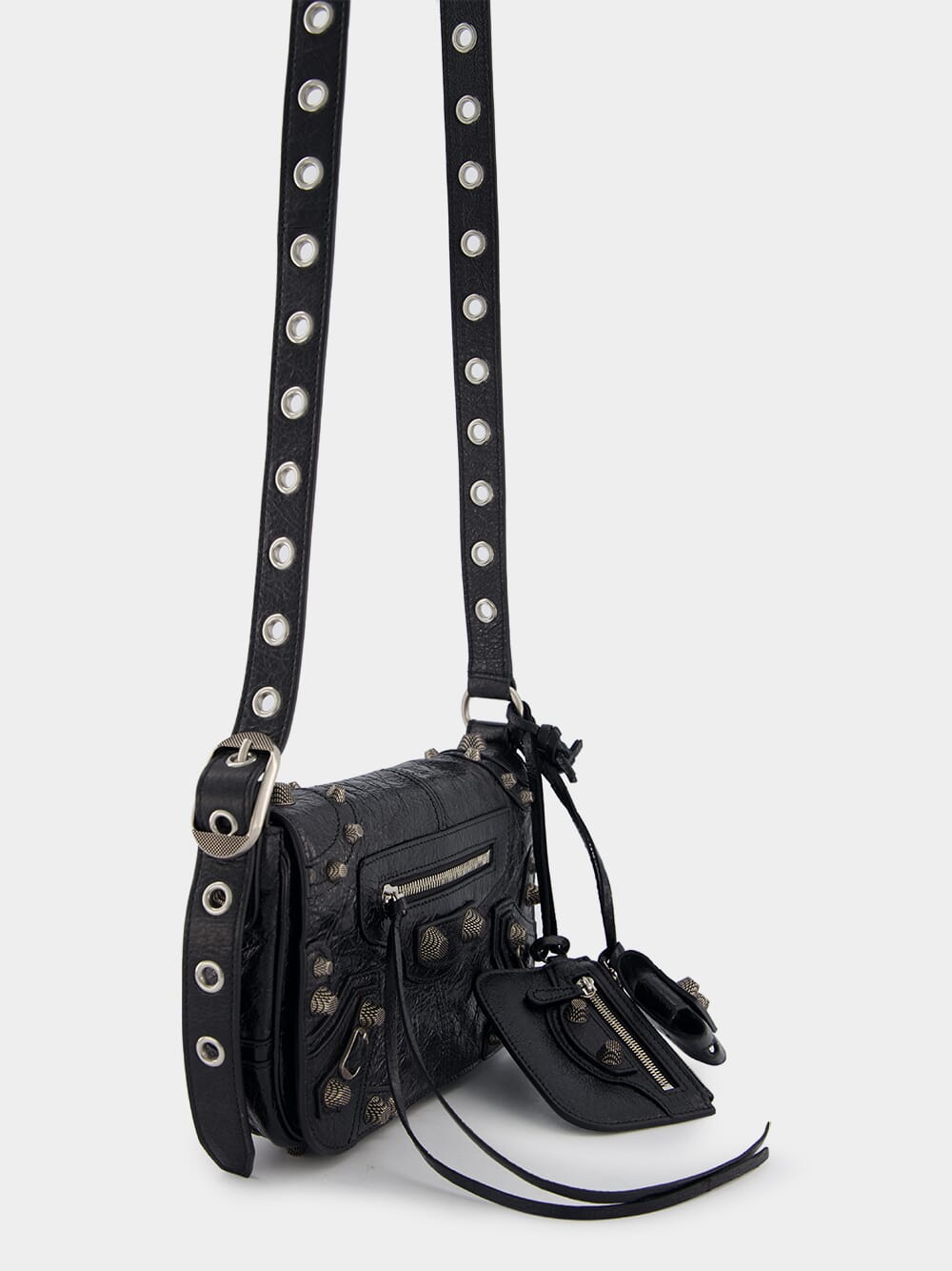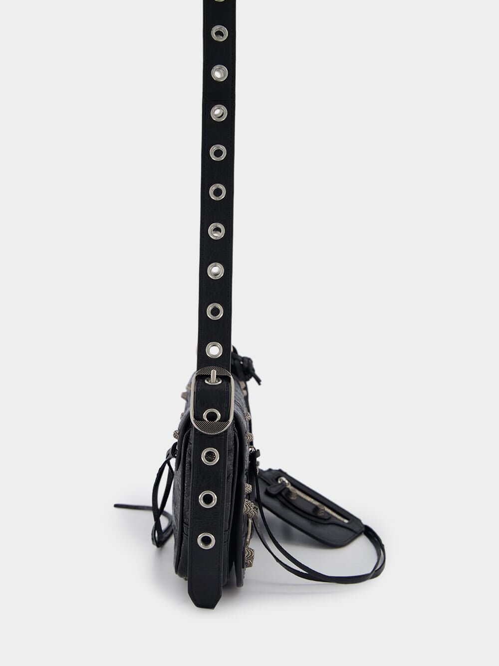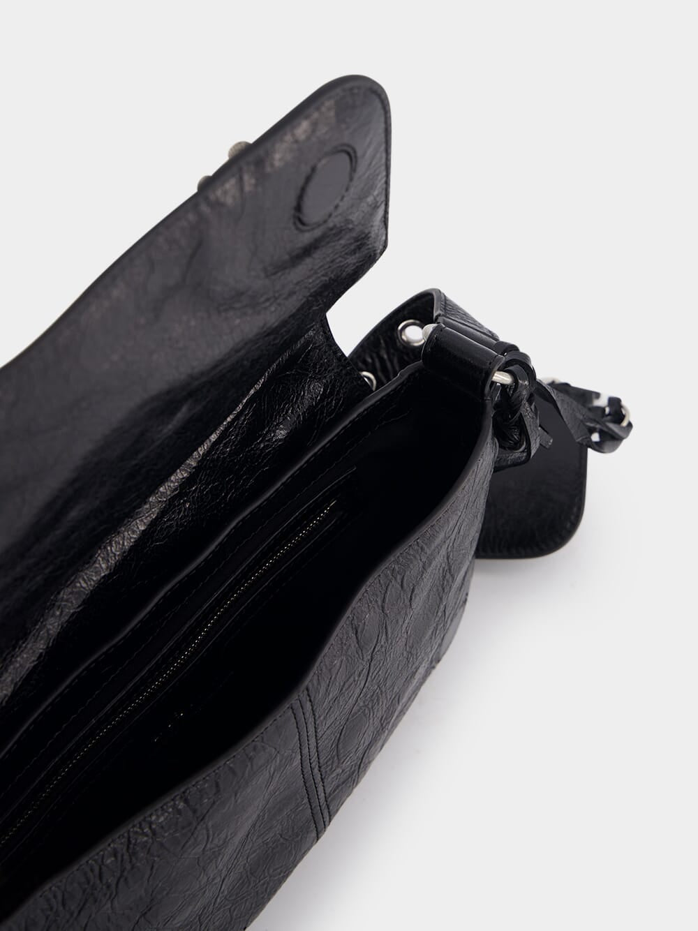 Le Cagole Men XS Flap Bag crafted for urban living, this flap bag features an adjustable strap with a leather braided shoulder pad for comfort. The aged-silver hardware, front zipped pocket, and flap closure with magnet add modern flair. With convenient inner and back pockets, plus a removable zipped pouch and EarPods holder, this bag effortlessly complements your on-the-go lifestyle.