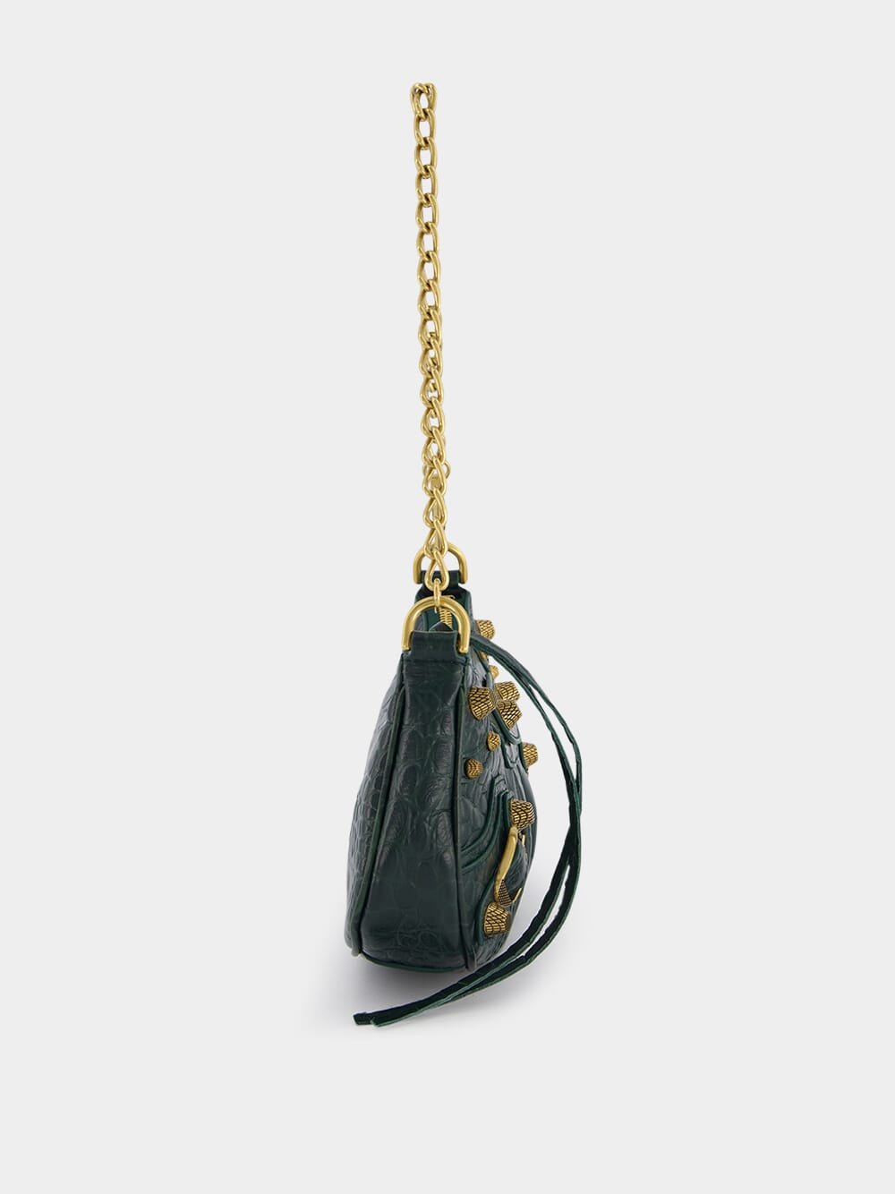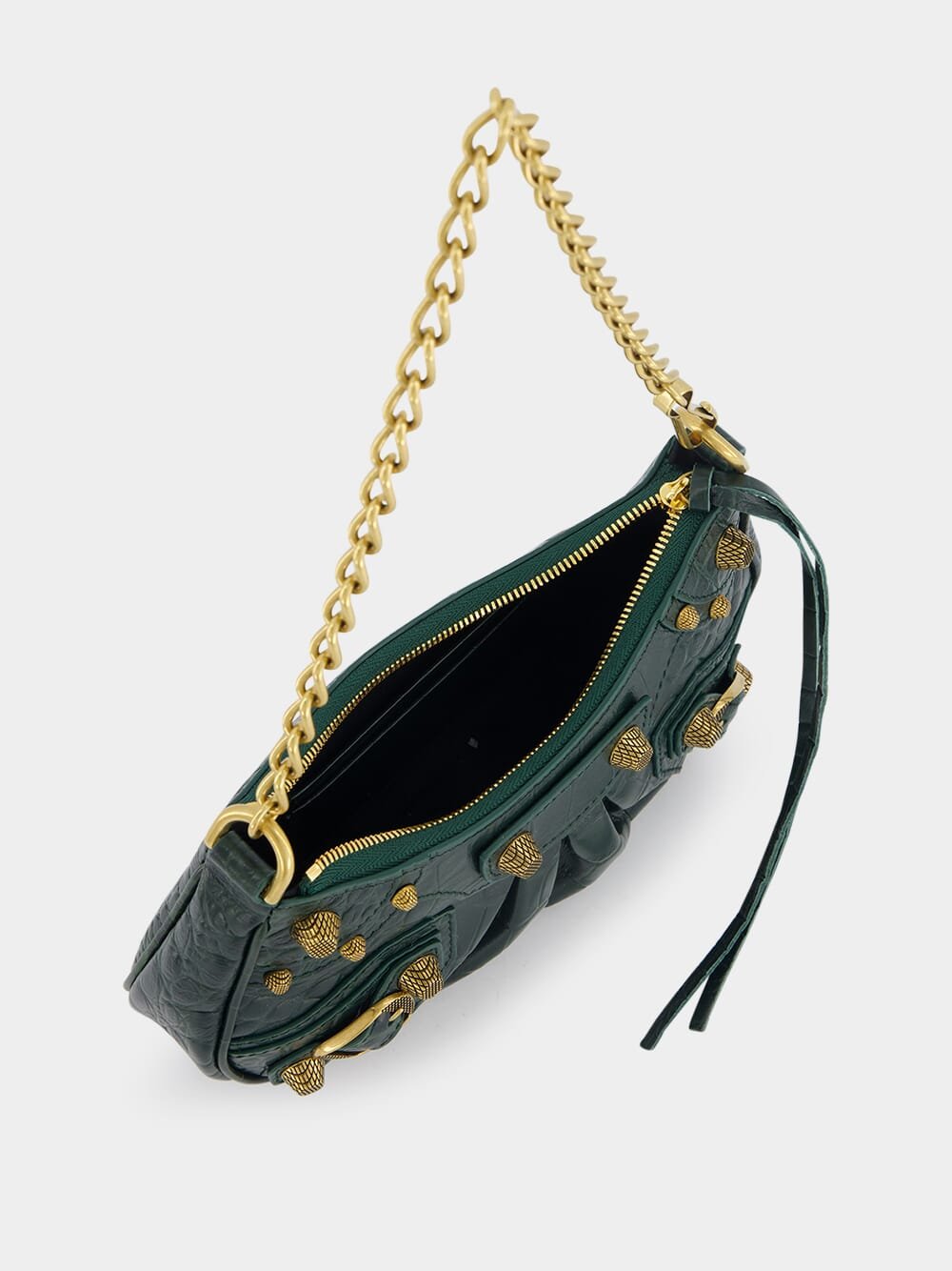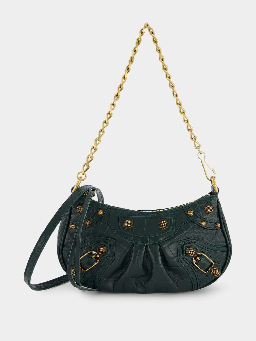 Balenciaga's nostalgic revival with the Le Cagole Mini Croc-Effect Leather Bag, reimagining a beloved style from the 2000s. Crafted from luxurious croc-embossed lamb leather, this bag boasts a unique and chic hemispherical shape. It features an outer zip pouch and a heart-shaped mirror charm, adding a playful and functional touch.