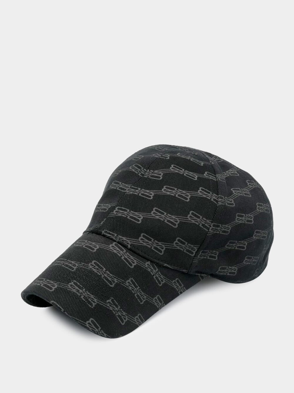 Balenciaga logo monogram cotton cap in black and grey with all-over print.