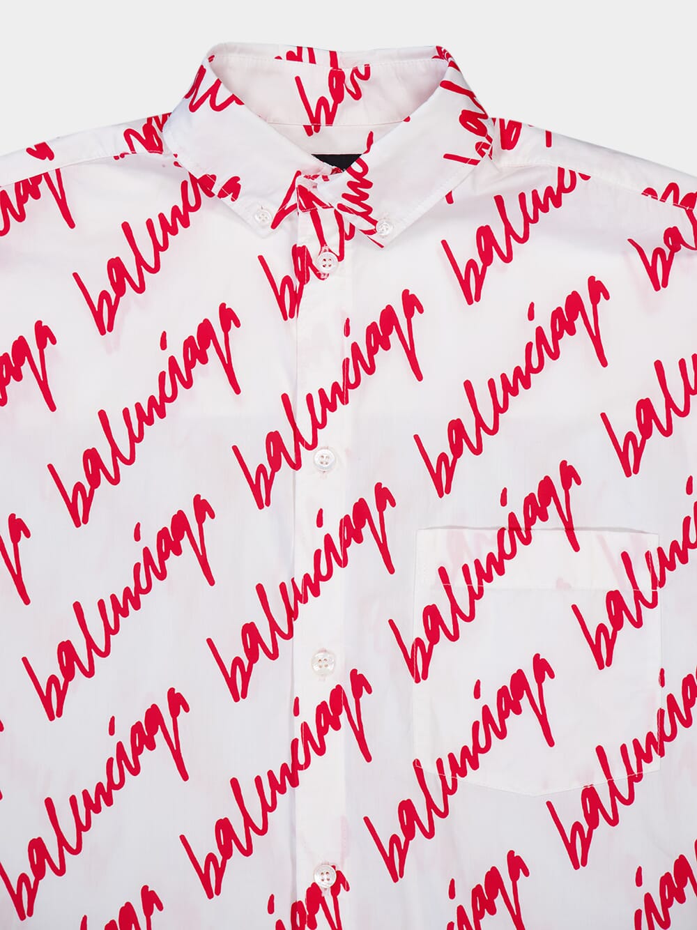 Scribble Rawcut Dress, tailored with a large fit for a comfortable and chic look. The button-down collar adds a touch of sophistication, while the raw edge short sleeves exude contemporary charm. With a trendy patch pocket at the chest and 10 Balenciaga engraved tone-on-tone buttons at the front, this dress is a true fashion statement. The mini slits at the side hem add a playful touch, complementing the below-the-knee length for a flattering silhouette.