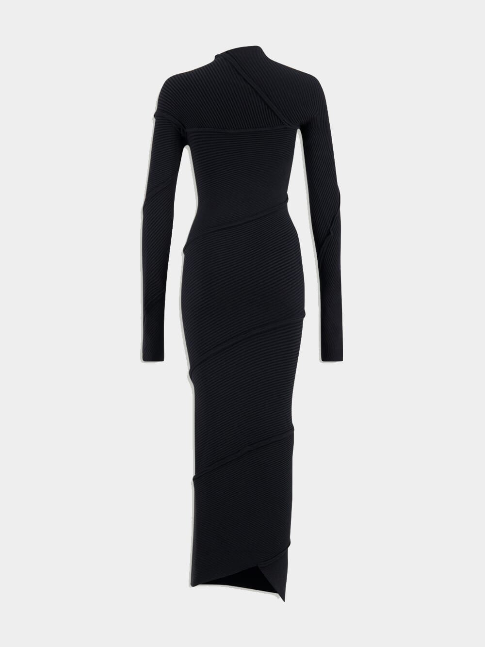 Spiral Maxi Dress, a true masterpiece of turning viscose knit craftsmanship. This fitted dress features ribbed detailing all over, creating a captivating texture. The spiral construction with exposed seams adds a touch of modernity and sophistication. Embrace both style and comfort with its crewneck and long sleeves, complemented by a bias finishing at the sleeves. With a flattering maxi length, this dress is the perfect choice for any elegant occasion.