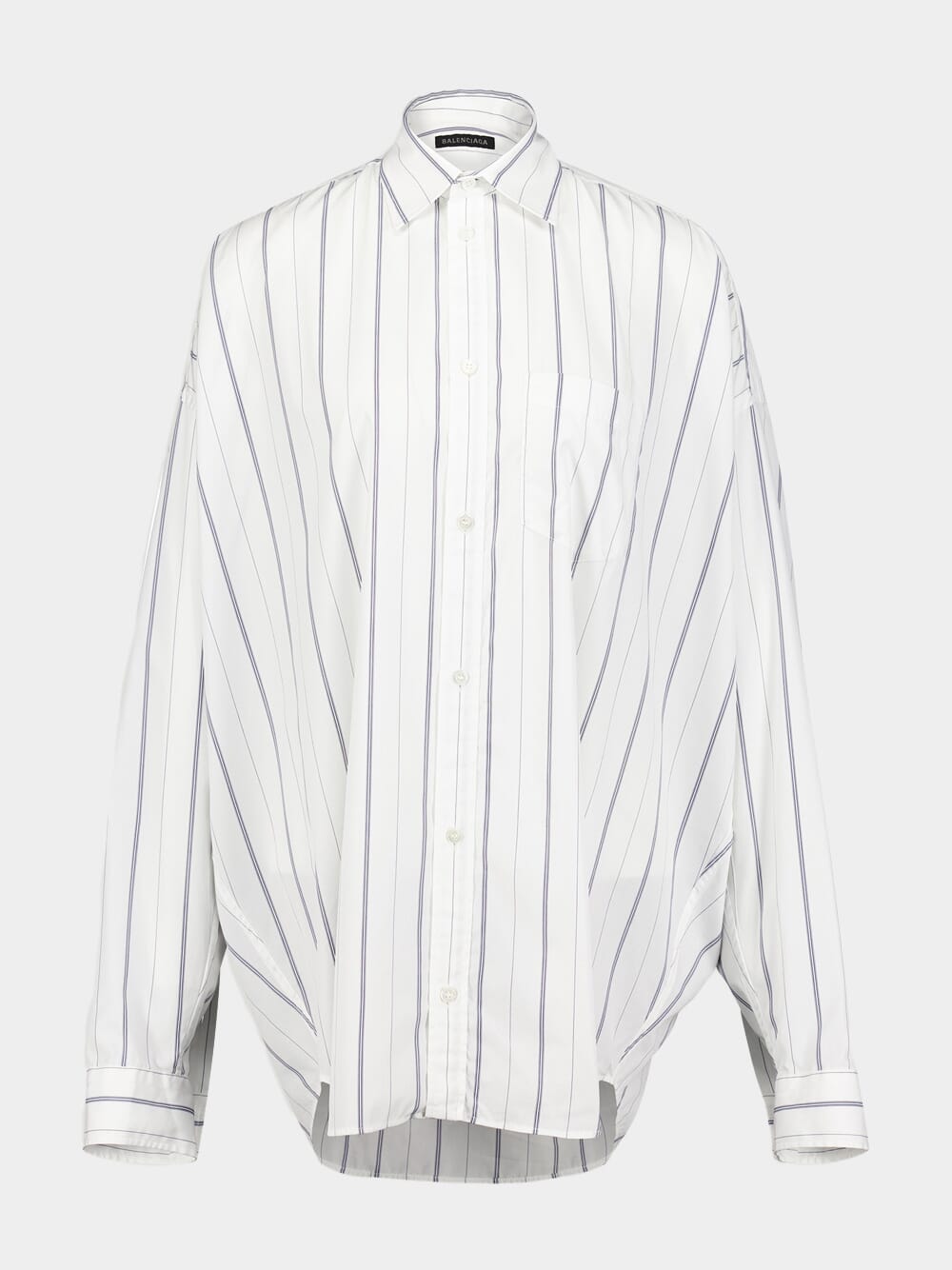 Stripe Poplin Cocoon Shirt, crafted with a classic collar and button closure, this shirt exudes effortless sophistication. Designed with long sleeves featuring buttoned cuffs, a patch pocket at the chest, and a gracefully curved hem, it offers both functionality and elegance.
