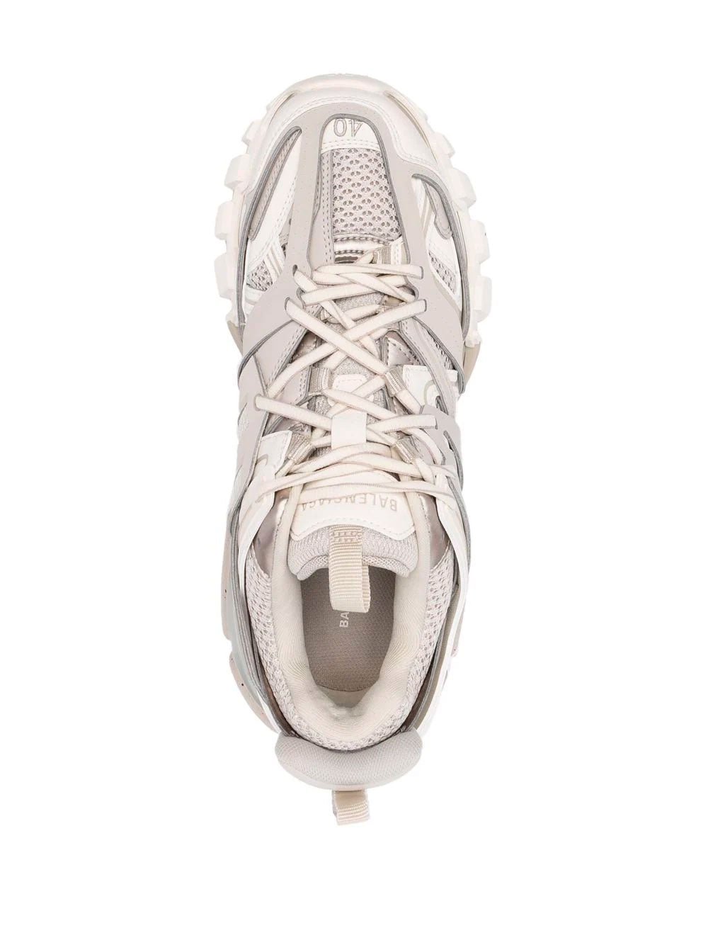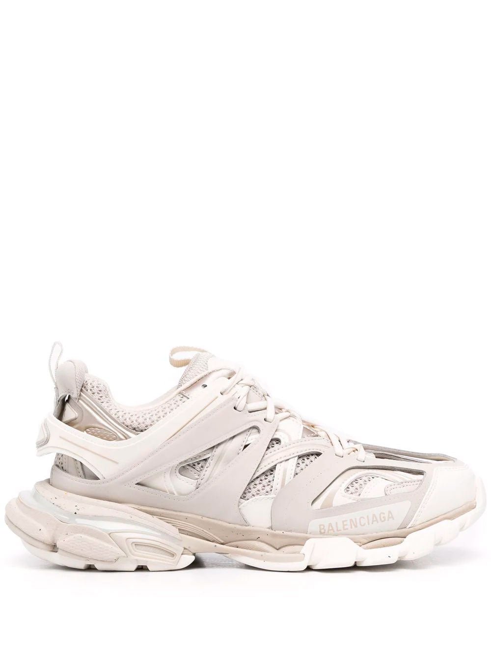 Balenciaga Track sneakers with a panelled design and mesh detailing, in beige. Featuring a printed logo on the side, double pull-tab at the opening with a logo patch, front lace-up fastening and a round toe.