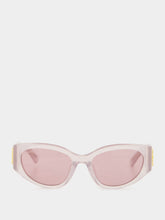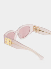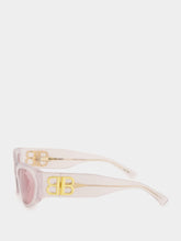 The Women's Bossy Round AF Sunglasses by Balenciaga are crafted from transparent light pink Eastman Acetate Renew, a sustainable material partially made of bio-based and recycled content. Featuring light pink bio-nylon lenses, they offer 100% UVA/UVB protection. The round shape and hidden hinges within the shiny gold BB logo add sophistication, while the lasered logo on the right lens enhances the luxury appeal. With an adjusted fit, these sunglasses seamlessly blend style and eco-conscious innovation. Made in Italy, they are not suitable for optical conversion.