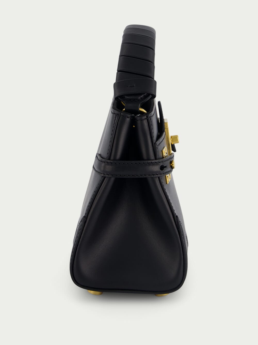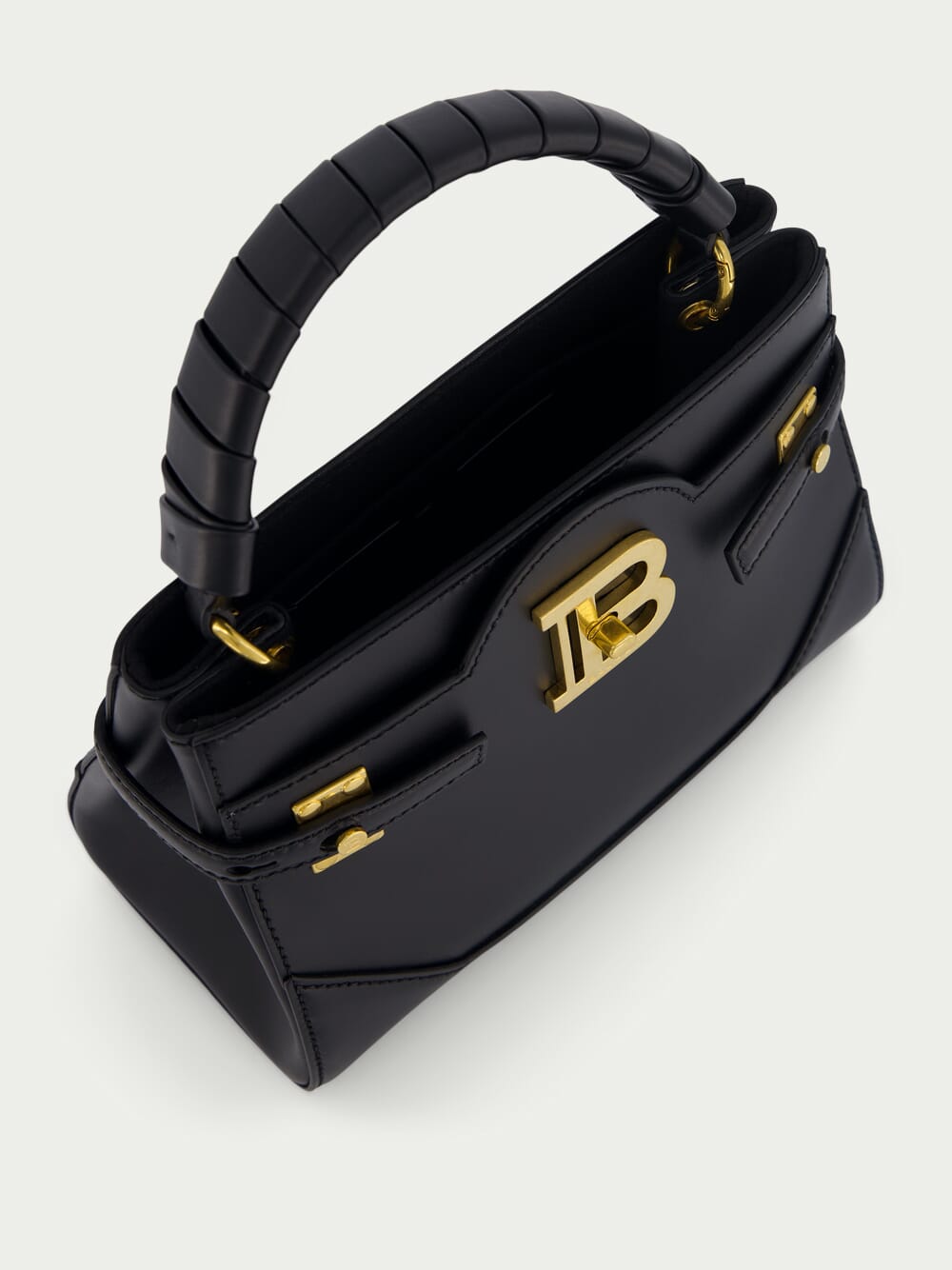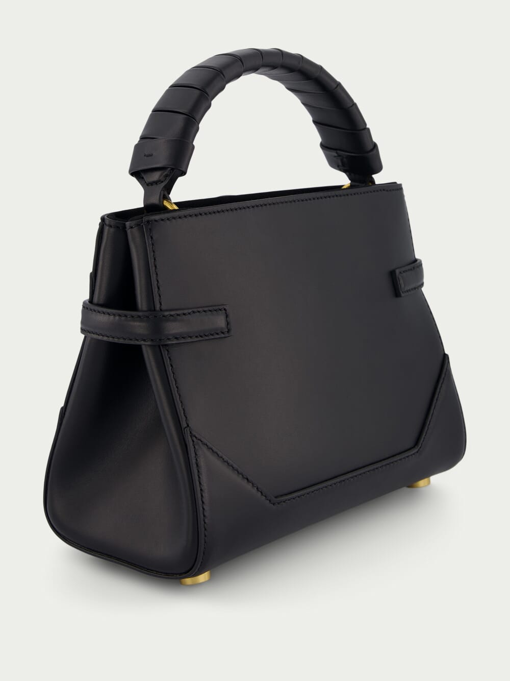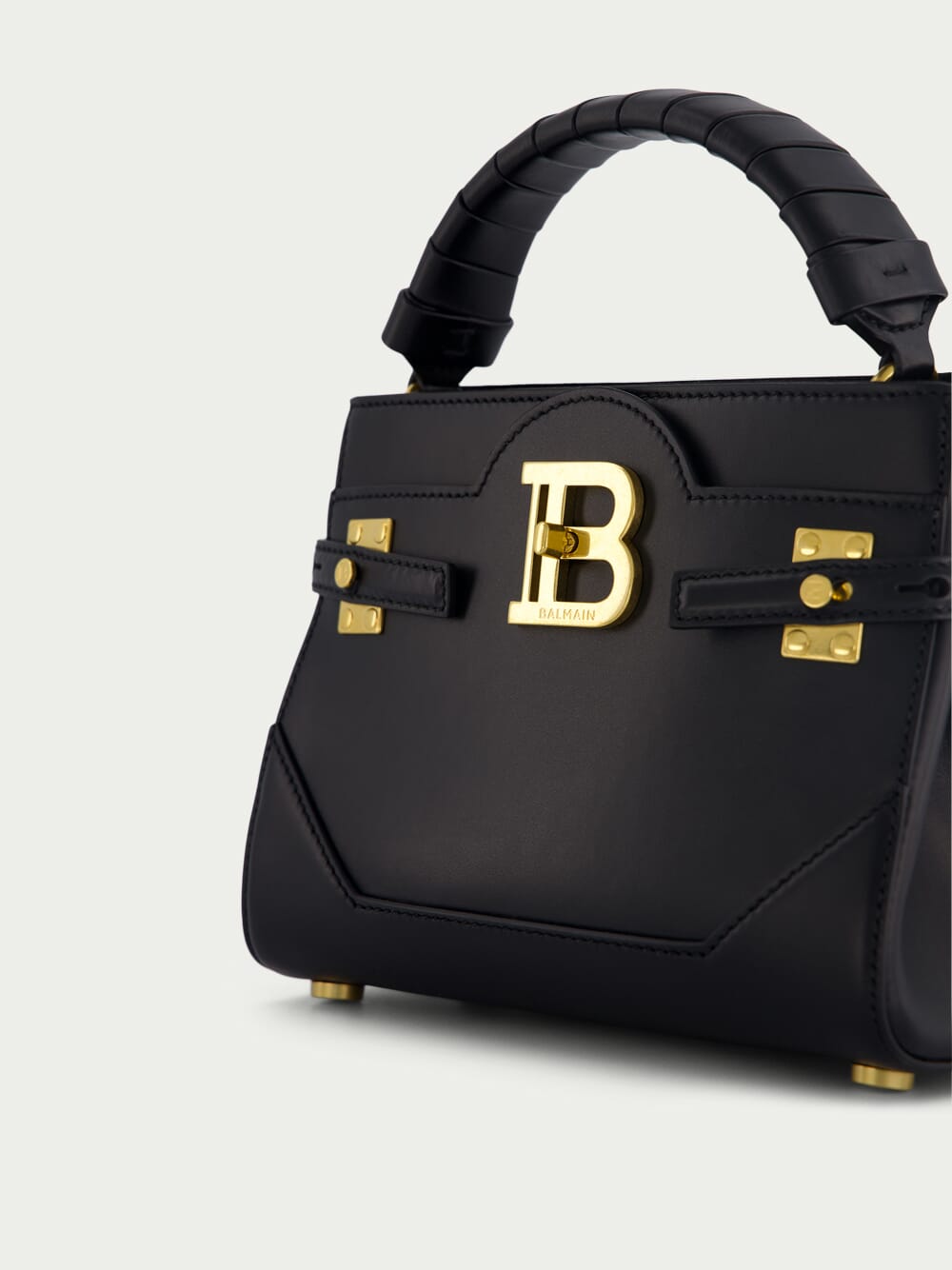 Balmain B-Buzz 22 top handle leather handbag featuring removable and adjustable leather shoulder strap, quarter-turn B clasp, interior zip pocket and gold hardware.