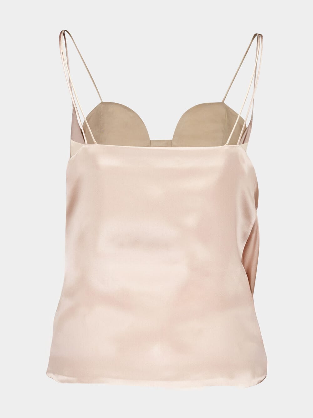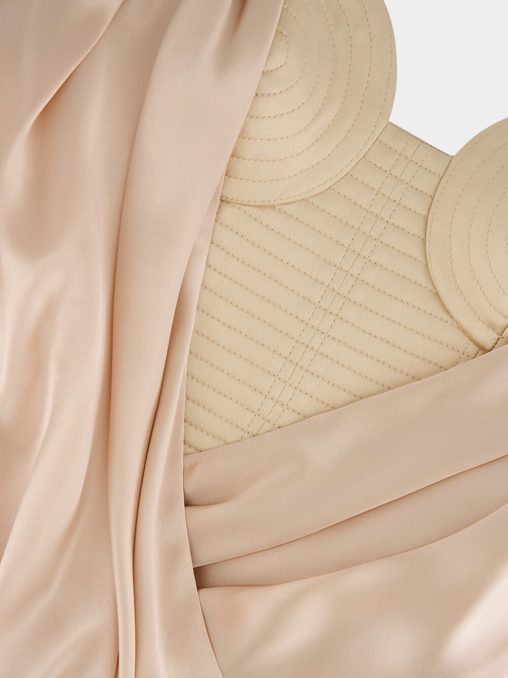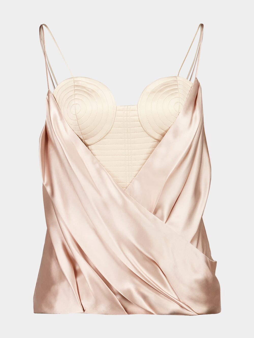 This beige strappy satin bustier top by Balmain features a sweetheart neckline and a sculpted, reinforced bodice for an elegant silhouette. Draped satin detailing over the fitted base enhances its luxurious appeal. A gold-tone metal back zip, engraved with Balmain Paris, adds a distinctive touch. Crafted in 100% silk, the cropped slim fit design offers a refined, modern elegance.